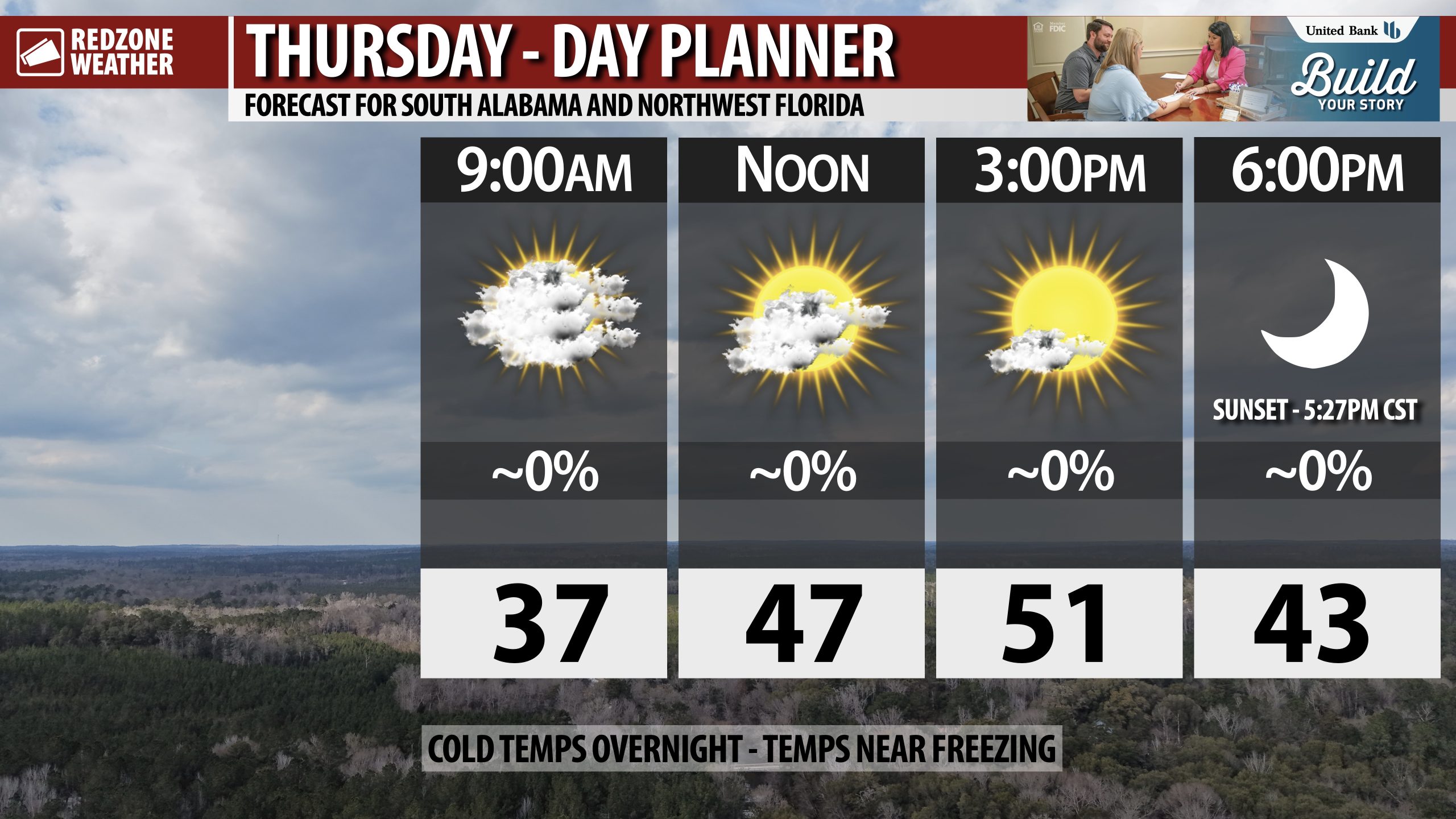 COLD TEMPS TODAY; TEMPS NEAR OR BELOW FREEZING TONIGHT; MILDER THIS WEEKEND… Keep the jackets handy on this Thursday as afternoon highs will be in the 40s inland with low 50s likely closer to the Alabama and northwest Florida beaches. Winter temperatures return today, tonight, and into Friday ahead of a warm up slated to happen this weekend. Warmer temperatures are on the way for next week. Dry conditions will happen through the weekend and into Monday and Tuesday.