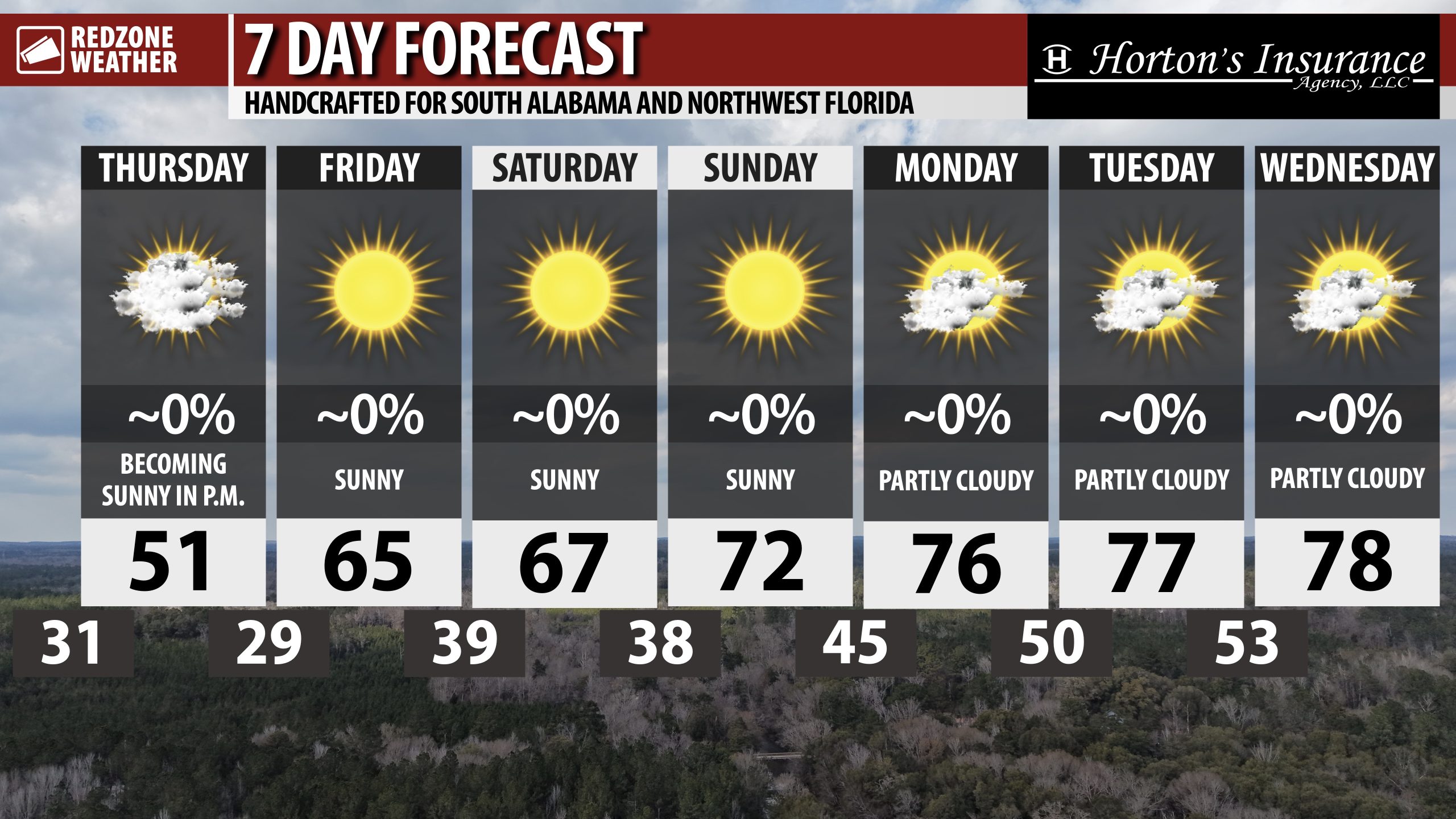MILDER TEMPS FOR THE WEEKEND… Afternoon highs will be in the 60s on Friday. Upper 60s are expected Saturday afternoon. Most communities across south Alabama and northwest Florida will be flirting with the 70 degree mark by Sunday.