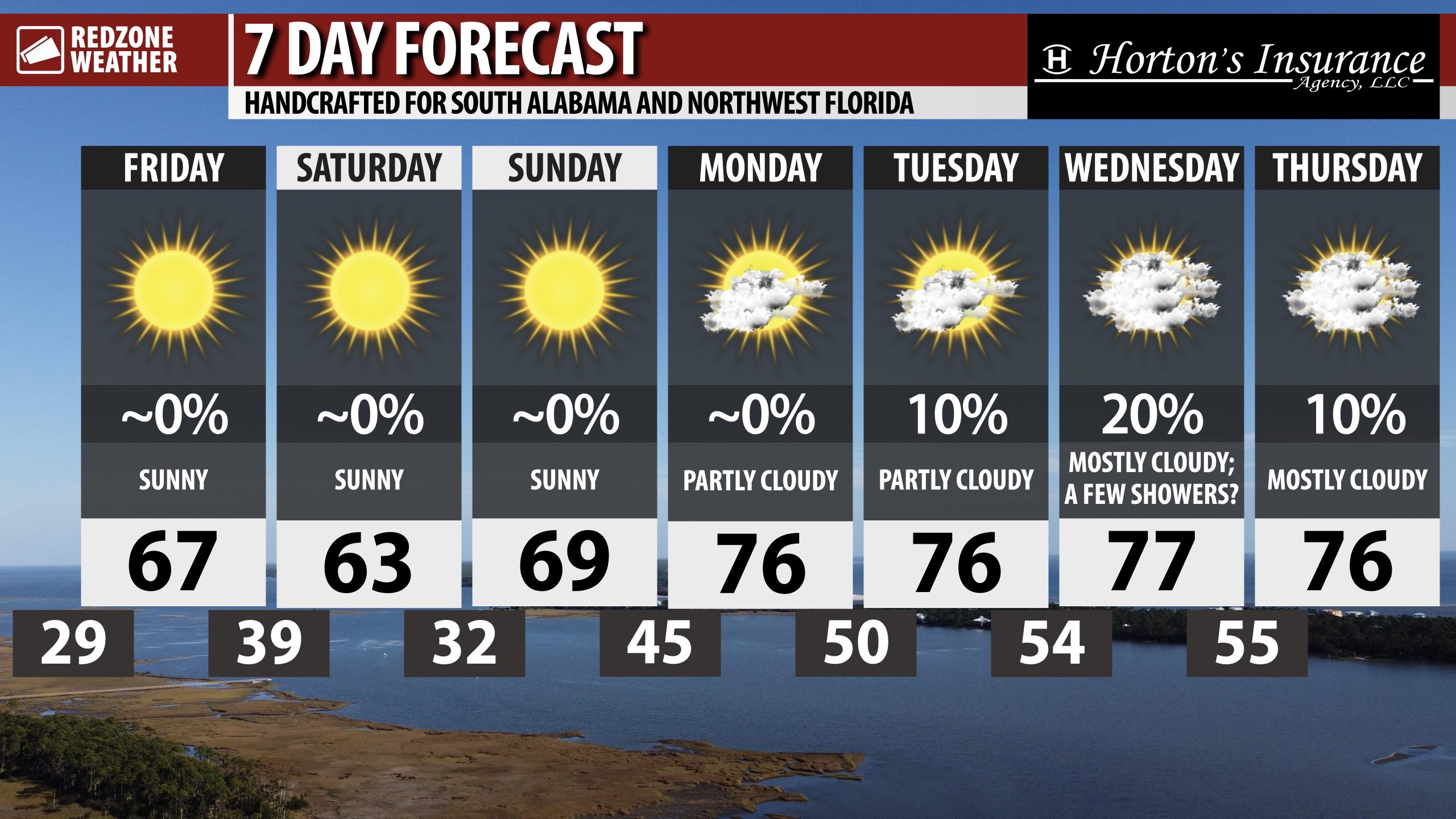 MILDER TEMPS TODAY AND INTO WEEKEND; SHOWERS POSSIBLE NEXT WEEK MIDWEEK… Sunny skies are in the forecast for south Alabama and northwest Florida on this Friday. Afternoon high temperatures will be about 12 to 14 degrees warmer than yesterday with most spots peaking in the 65-69° range today. Clear skies will happen tonight with lows in the 40s. More sunshine is in store for Saturday and Sunday with highs expected to be in the 60s. Fantastic weather will continue through the weekend and into early next week.