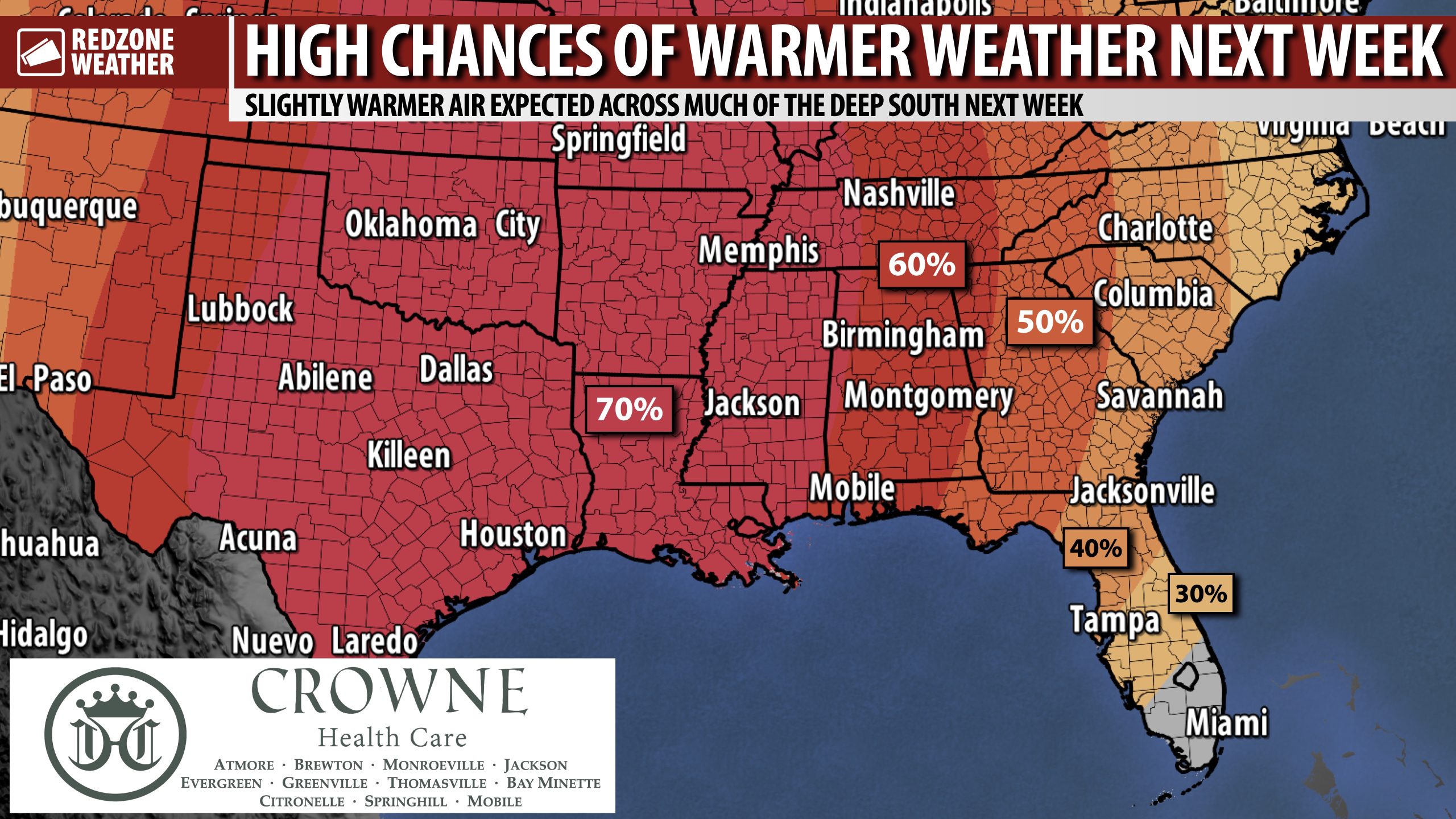 WARMER TEMPS NEXT WEEK… The consistent flow of Arctic air into the Southeastern U.S. over the last number of weeks has been shut off, meaning we will have (overall) milder/warmer temperatures in store for the foreseeable future. Afternoon high temperatures are expected to be in the mid 70s next week with morning lows in the 40s and 50s.