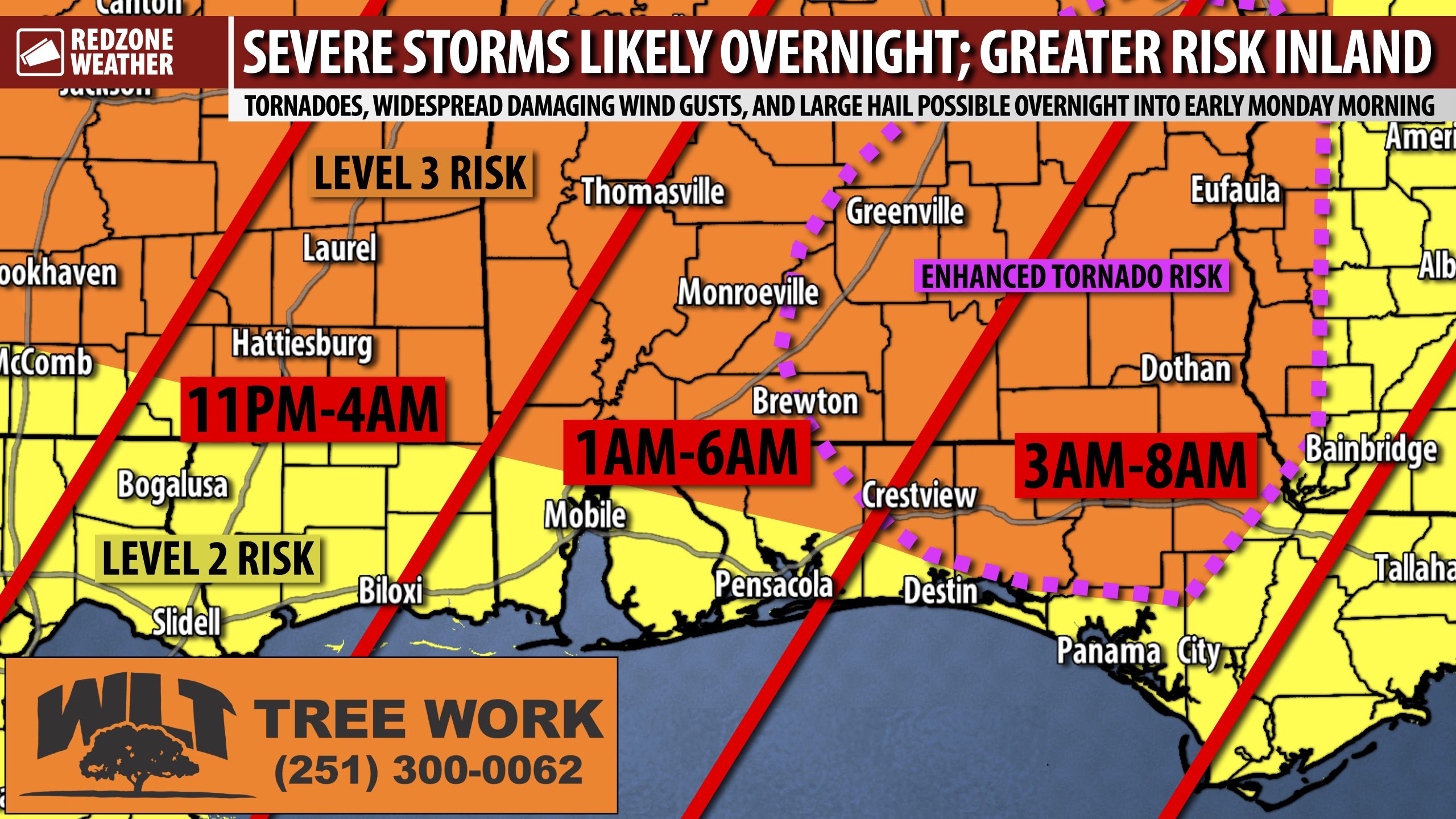 8) COVERAGE… I provide live streaming video coverage via our RedZone Weather app and on redzoneweather.com during tornado warnings for 12 counties in southwest Alabama and in northwest Florida. Some of you reading this post are NOT in our local area. While I appreciate you reading this, I would suggest finding out NOW who covers tornado warnings in your specific area. redzoneweather.com/coverage outlines our coverage policy extensively. Find a weather source you trust and watch the information overnight into tomorrow morning.