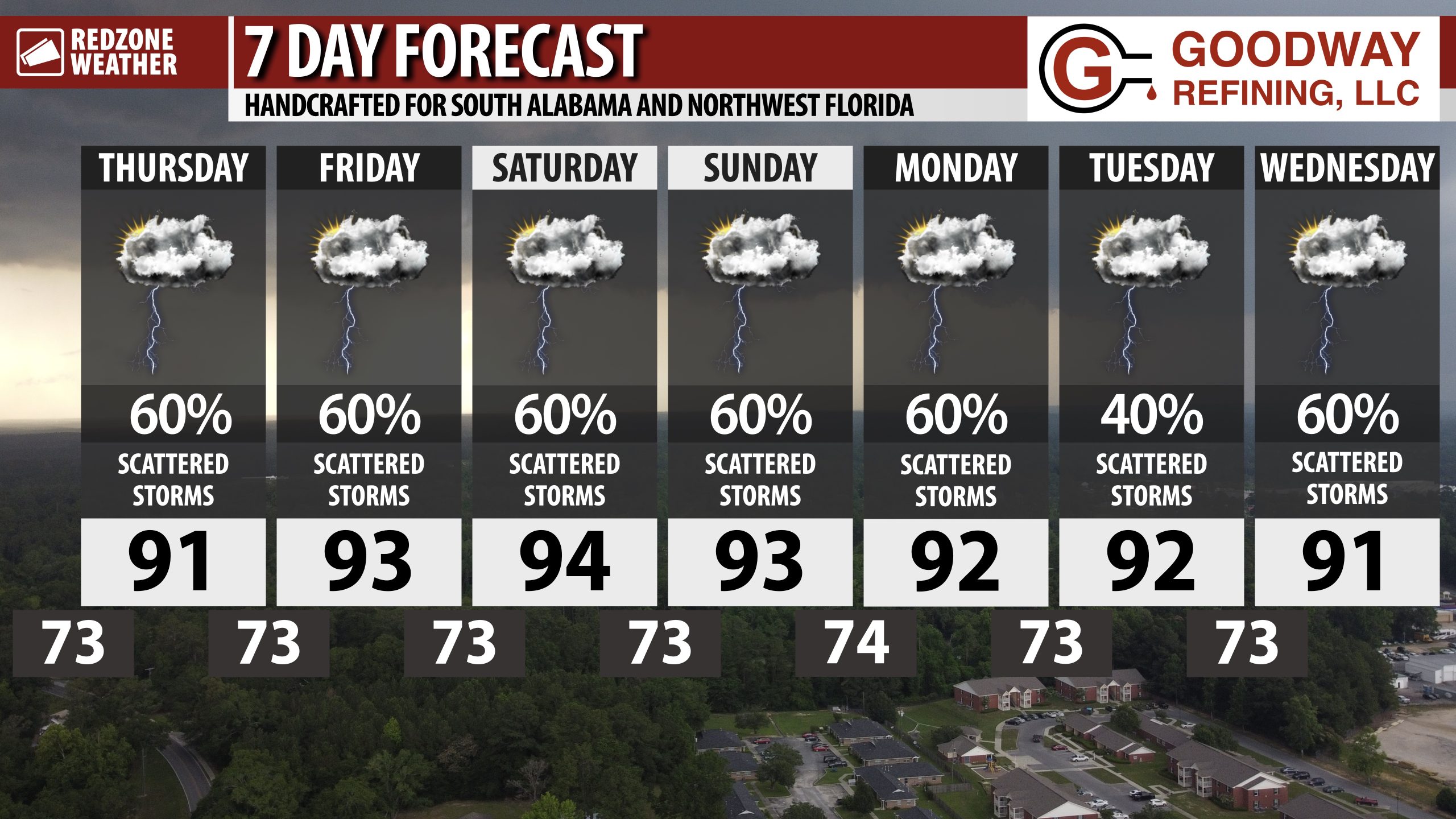 Posted inBlog 8:12AM June 19, 2025 Posted by spinks June 19, 2025No Comments CONSISTENT, SUMMERTIME PATTERN AHEAD… Pop-up storms will continue to be possible all across the region each day over the next 7 days. High temperatures will consistently be in the low 90s with morning lows in the 70s. Post navigation Previous Post 6:51AM June 19, 2025Next Post9:21AM June 19, 2025