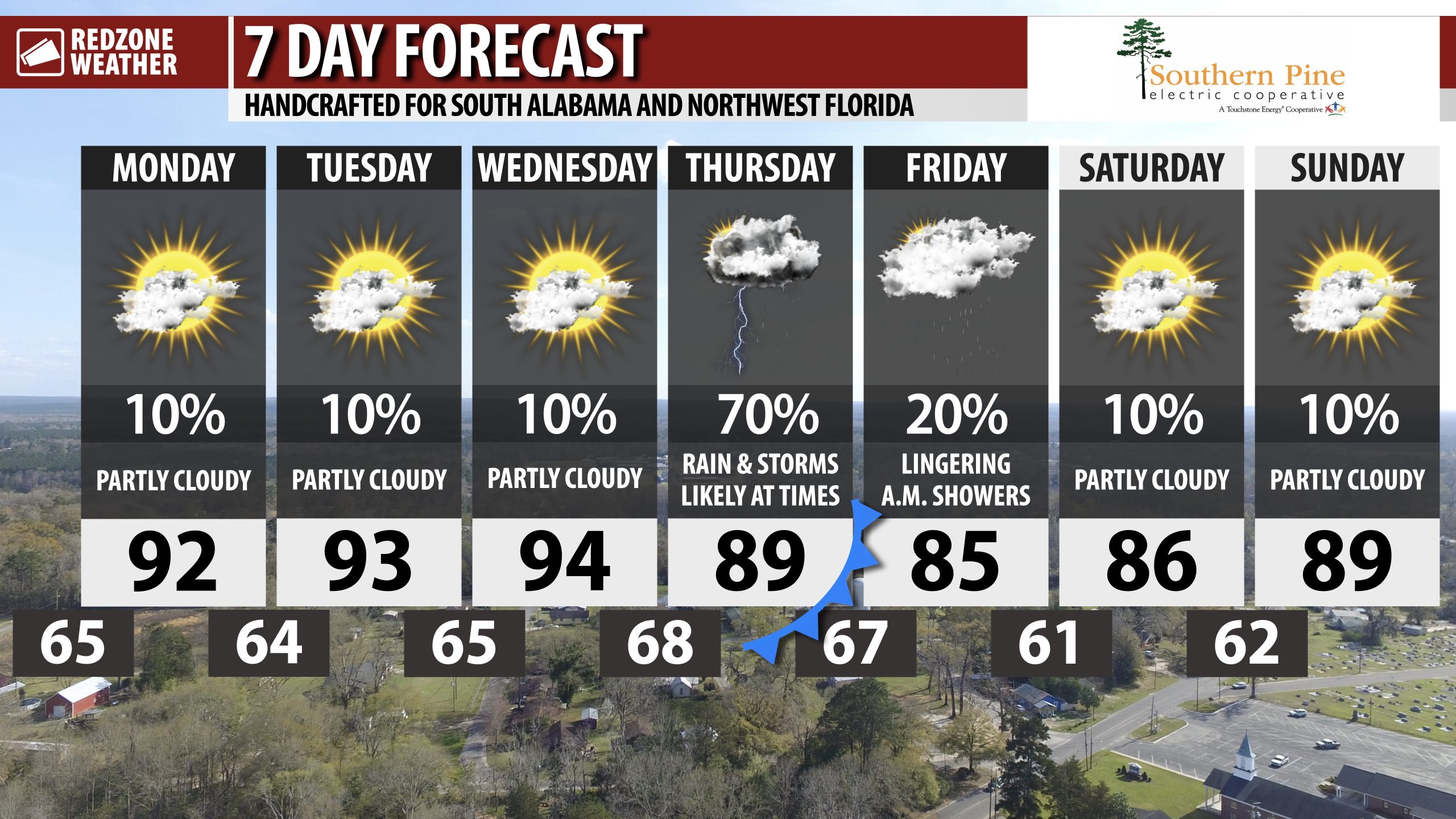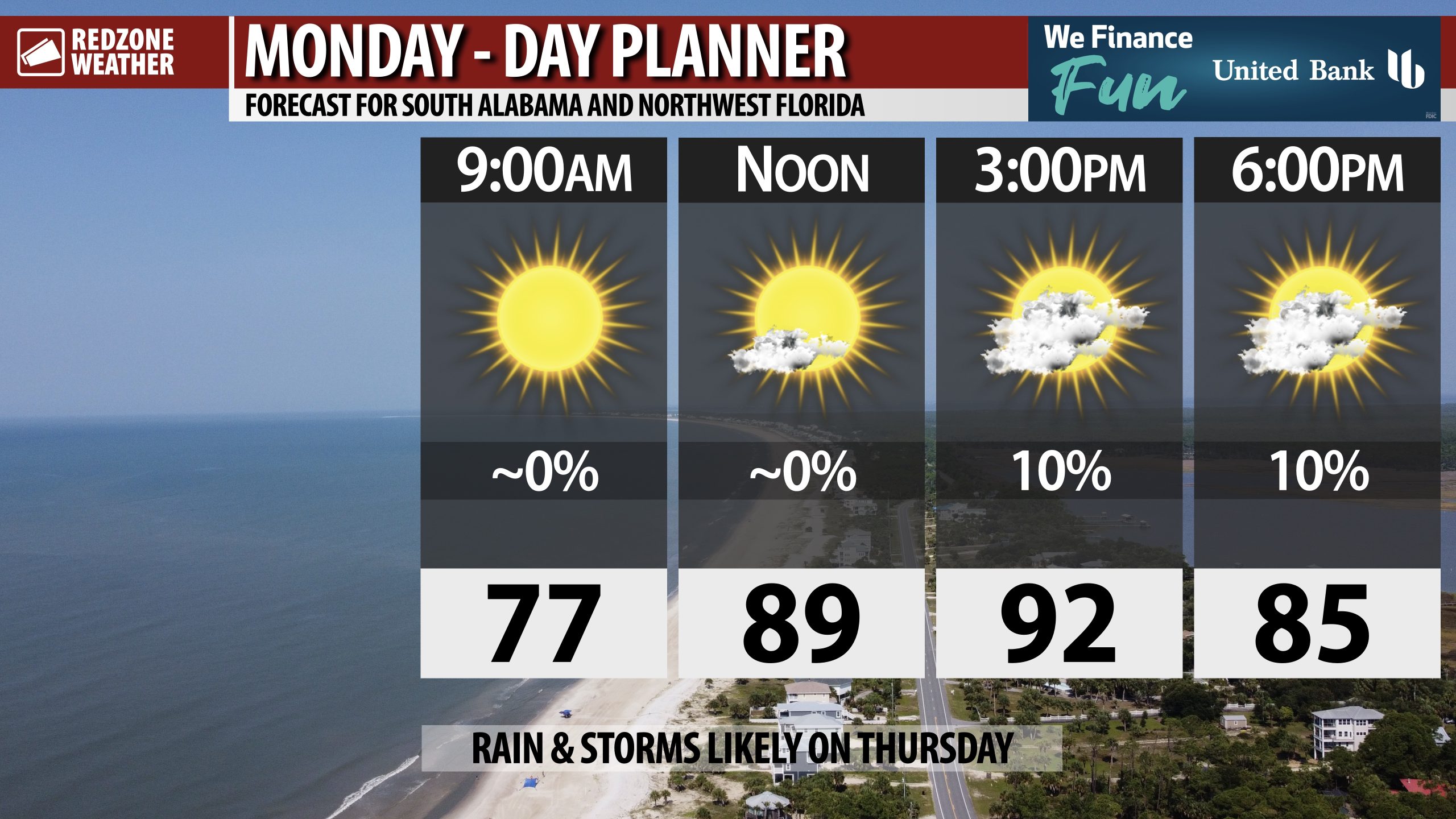 HOT TEMPS, FEW SHOWERS LATER TODAY; RAIN & STORMS LIKELY LOCALLY THURSDAY… Isolated showers and perhaps a few thunderstorms will be possible on this Monday across south Alabama and northwest Florida. Most of the rain and storms will happen between 1PM and 8PM. Not every community will have rain before the end of the day. Many communities will likely remain dry into the evening hours. High temperatures will be in the low to mid 90s across the region. More hot days are coming up on Tuesday and Wednesday ahead of rain and thunderstorms being likely on Thursday as a cold front approaches from the northwest.