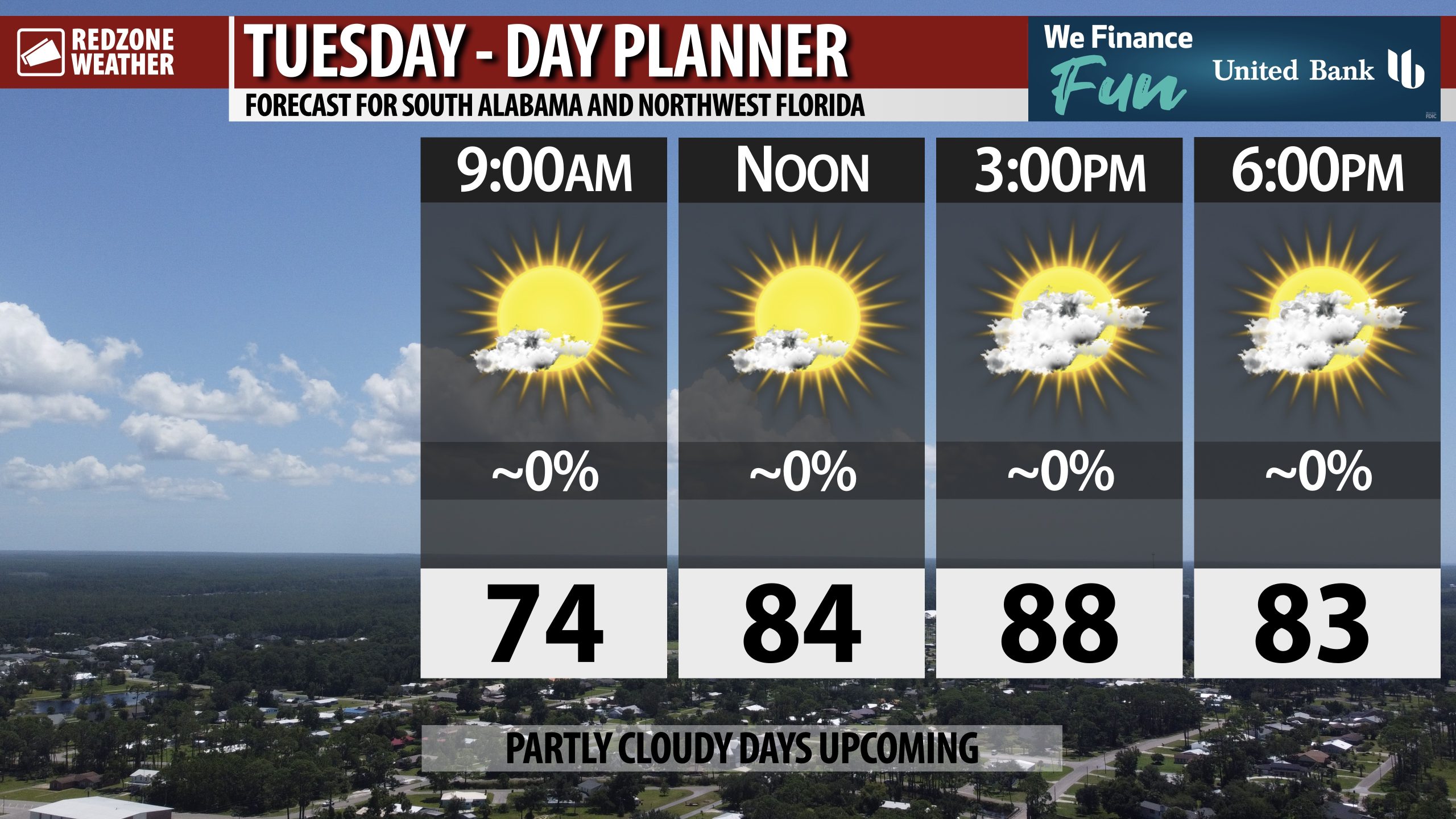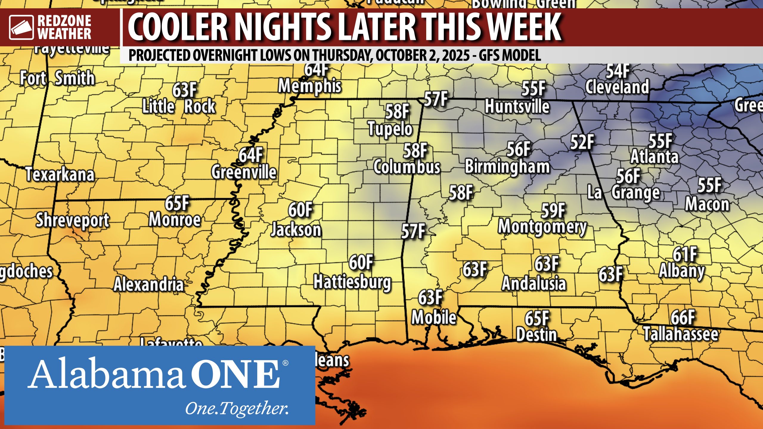 SLIGHTLY COOLER LATER THIS WEEK INTO THE WEEKEND… Overnight lows will be in the upper 50s further inland with 60s likely across much of south Alabama and northwest Florida as we get into the latter part of the week and into the upcoming weekend. The map attached highlights projected overnight lows on Thursday night into early Friday morning. It’s a sign that fall is coming. We usually have a slow progression of cooler temperatures in the fall months and this year will be no exception. Highs will be in the upper 80s tomorrow with low 80s expected for highs later this week.