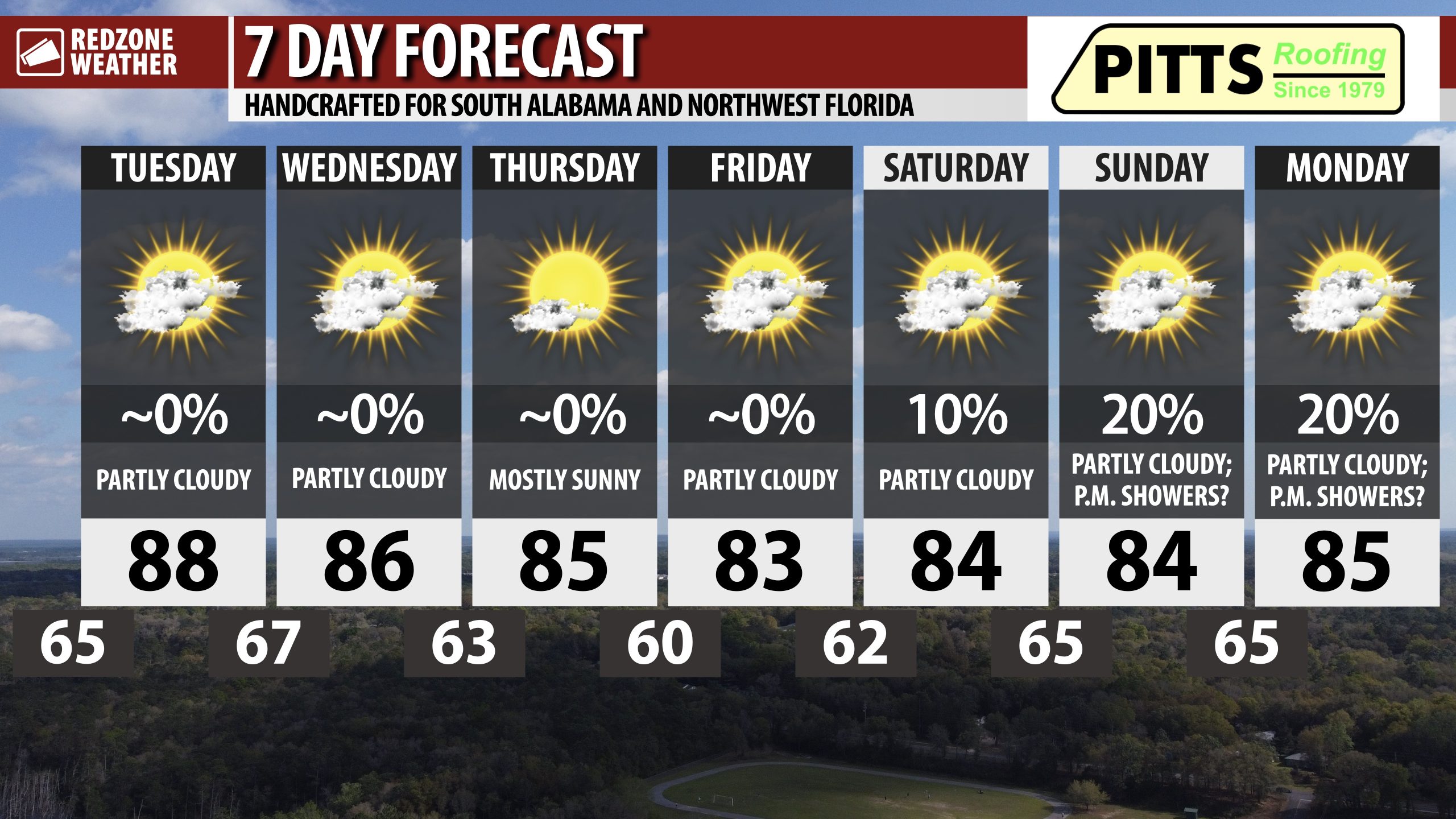 SHOWERS POSSIBLE AT TIMES THIS WEEKEND INTO EARLY NEXT WEEK… You may see some information suggesting the potential for a tropical storm in the northern Gulf later this week or this weekend. That is because one model (the American-based GFS) has been fairly consistent in showing a Gulf low developing and moving inland this weekend. This would pave the way for scattered showers and storms across our local area, perhaps on Sunday into Monday. We note that other major models, including the ECMWF/Euro, show a less robust system with only isolated showers around this weekend into early next week. That is the solution we will go with in our 7 Day Forecast, for now. We simply need more evidence to be able suggest higher rain chances – and right now, that evidence simply isn’t there. If that changes, I’ll let you know about it in the RedZone Weather app.