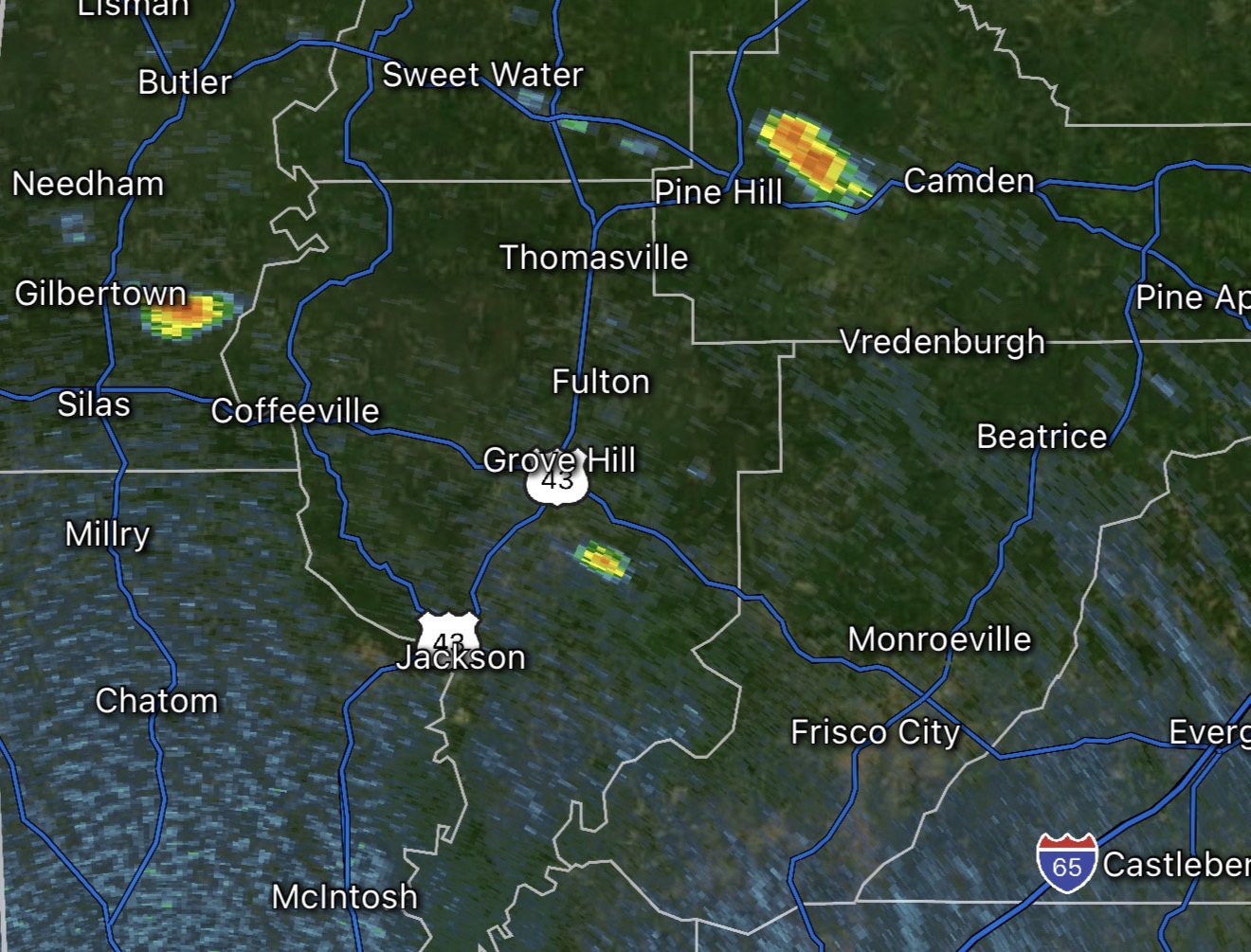 The first of what will probably be several showers and thunderstorms over the next few hours has developed in parts of Wilcox County, AL near Yellow Bluff and Possum Bend, just west of Camden.
