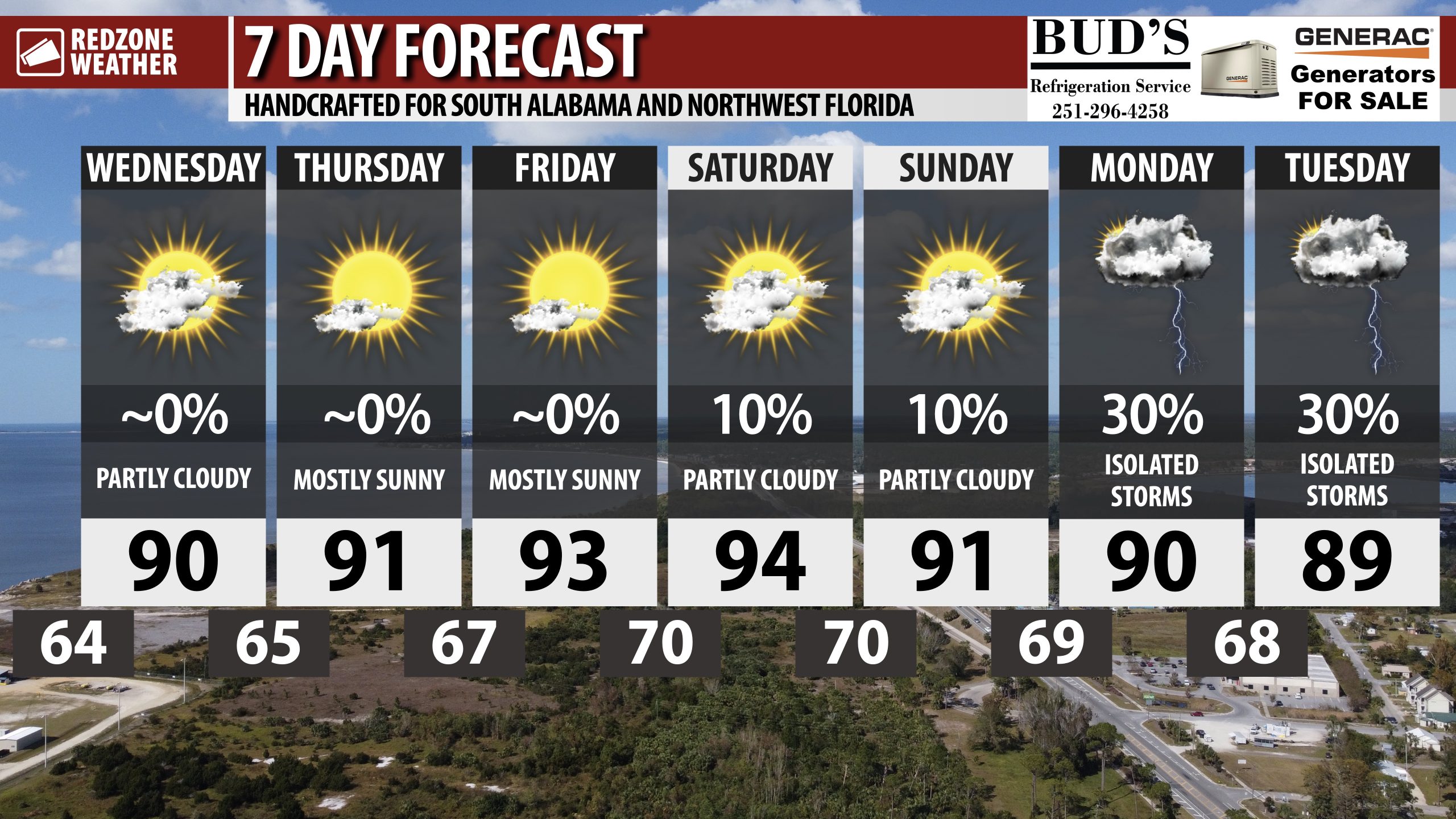 PARTLY CLOUDY THIS AFTERNOON; HOTTER TEMPS INTO WEEKEND… Rain chances remain quite low on this Wednesday with partly cloudy skies expected in the afternoon and evening hours. High temperatures will be near 90 degrees this afternoon with some spots briefly hitting 91-92°. Dry conditions are likely tomorrow ahead of rain chances increasing slightly as we get into the weekend with increasing humidity values as well. We will trend toward pop-up thunderstorms returning to our local forecast next week.