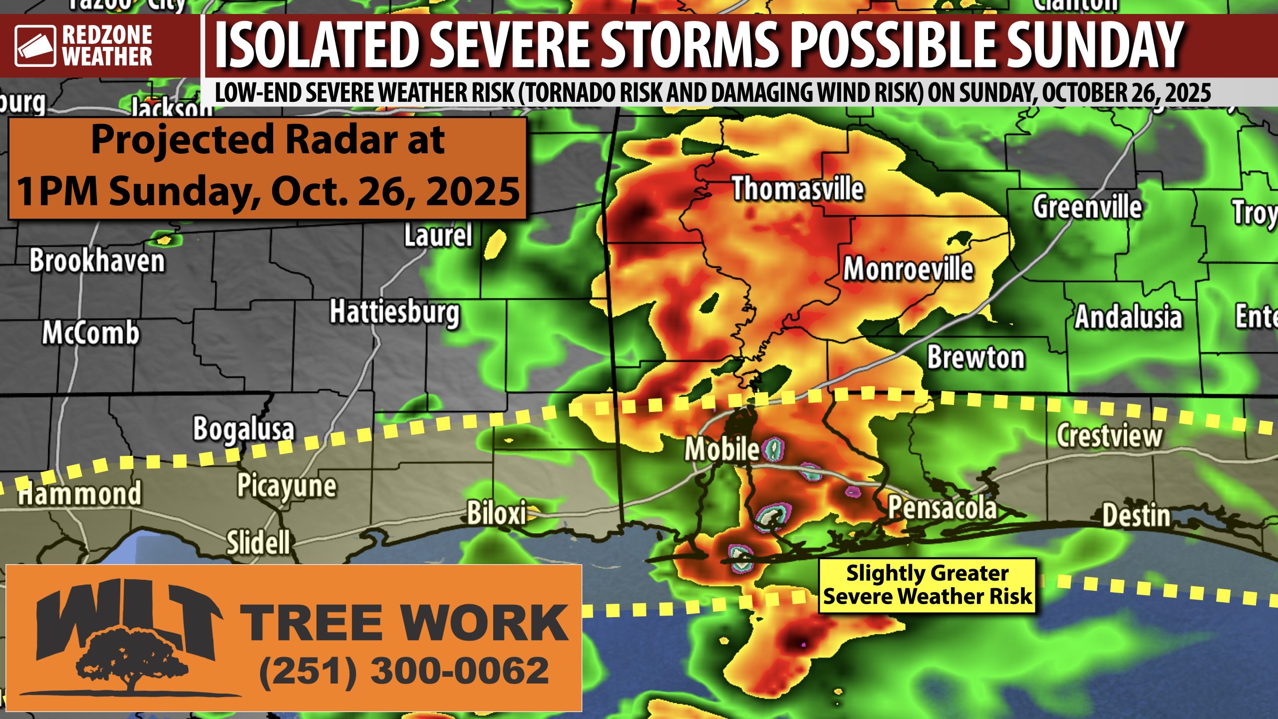 The Storm Prediction Center has added a low-end, Level 1 (out of 5) tornado risk valid for Sunday that includes southwest Alabama, northwest Florida, southern Mississippi, and eastern Louisiana.