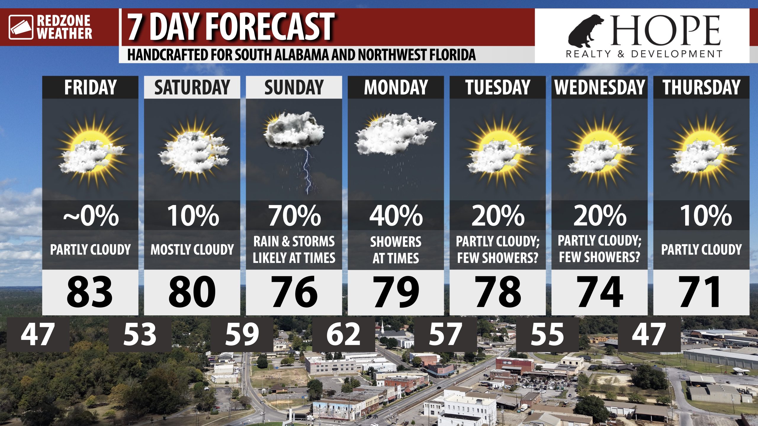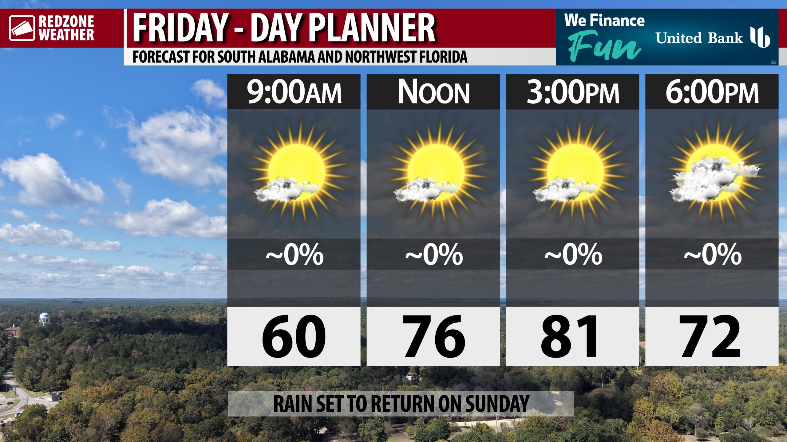 DRY TODAY; RAIN RETURNS SUNDAY; A FEW STRONG STORMS POSSIBLE NEAR COAST… Nice weather continues across the region on this Friday. High temperatures will be around the 80 degree mark. Cloud coverage will increase across the region this afternoon into this evening ahead of mostly cloudy skies on Saturday. Rain returns to our local area on Sunday ahead of an advancing front. Isolated strong to severe thunderstorms may become possible near the Alabama and northwest Florida beaches on Sunday. This is a potential I will be closely monitoring over the next 48 hours. I will have the latest details delivered to you in the RedZone Weather app.