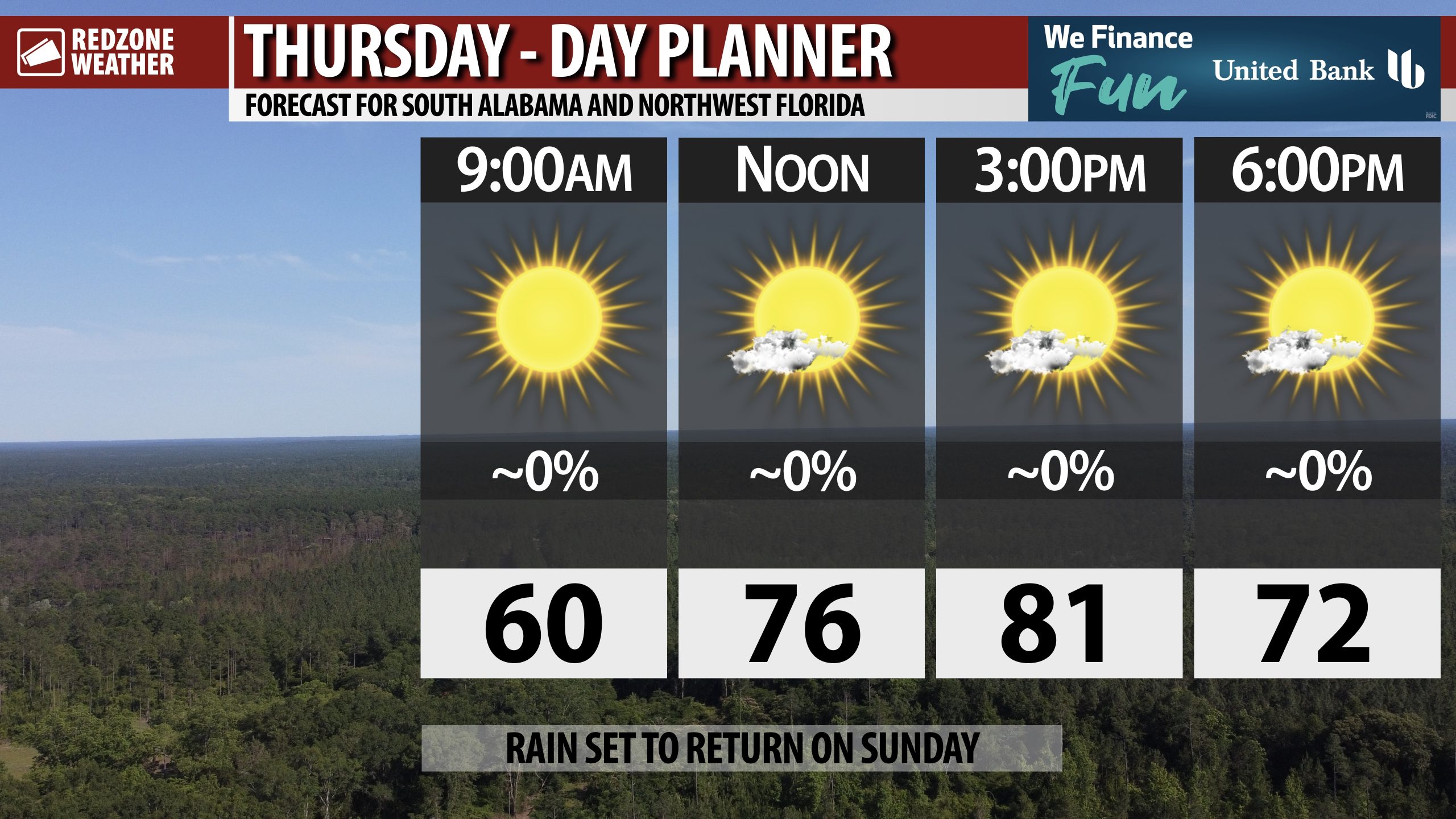 NICE THURSDAY; RAIN & STORMS SUNDAY… Mostly sunny and nice weather will continue across south Alabama and northwest Florida on this Thursday. High temperatures will be in the low 80s today. Temperatures will dip into the 60s by 7PM this evening with overnight lows expected to be in the 40s by the time we get to 7AM Friday. Tomorrow is also expected to be a dry day with high temperatures in the mid 80s.