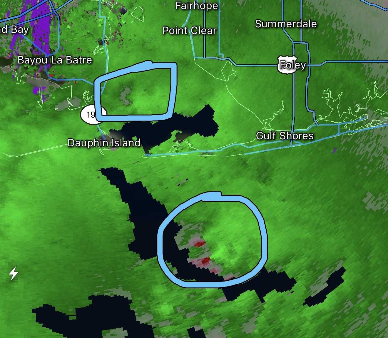 Stronger rotation associated with a supercell in the northern Gulf is circled. That cell is about 15 miles southwest of Gulf Shores.