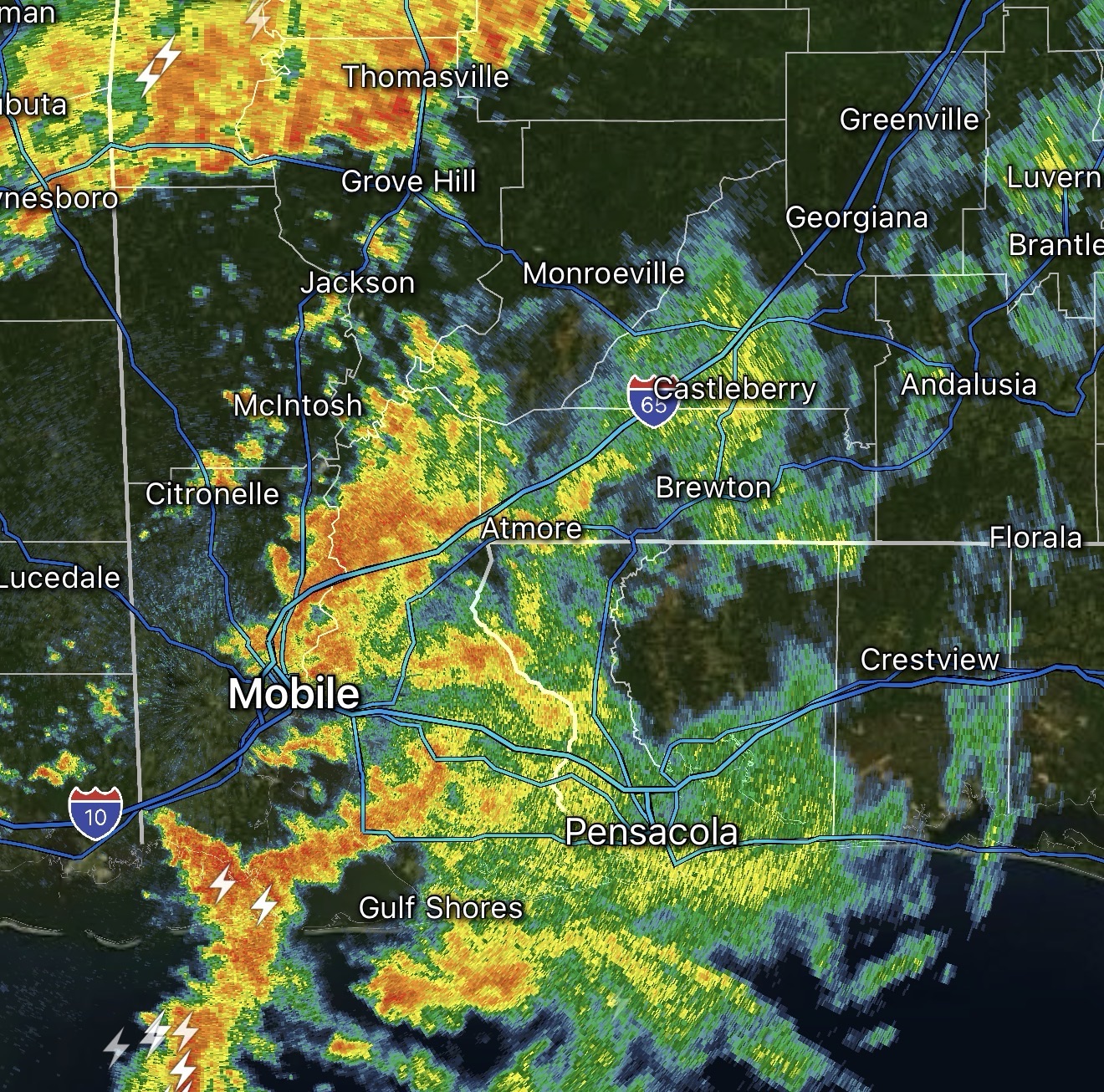 There is quite a bit of rain and general (non-severe) thunderstorms happening elsewhere across the region, but these storms (near Bay Minette, Pensacola, Atmore, Evergreen) are not severe.