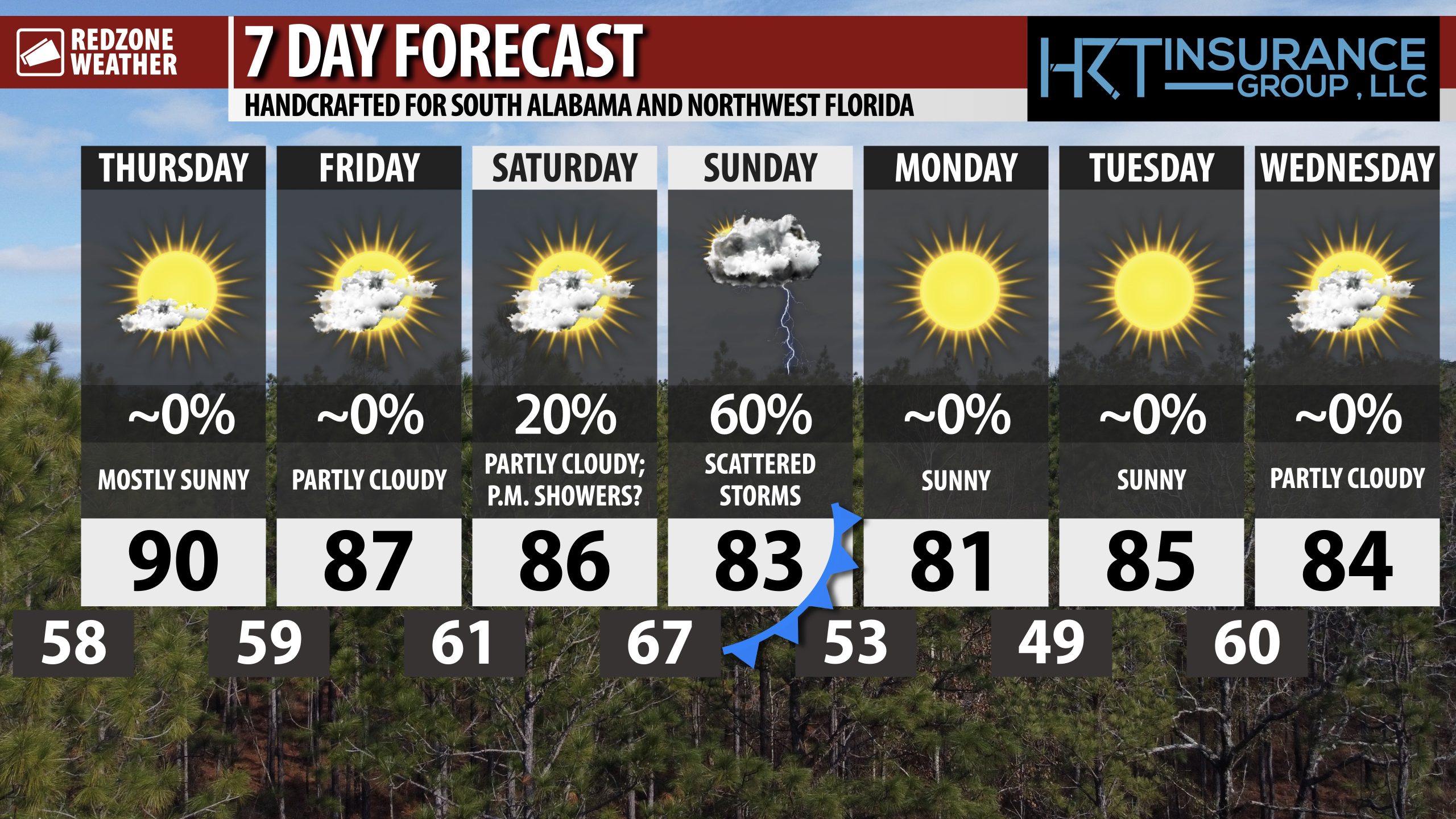 SUNNY THURSDAY; SPOTTY STORMS AT TIMES SATURDAY NIGHT INTO SUNDAY… Rain may be possible in some communities this weekend but before we get there, ample sunshine is expected across south Alabama and northwest Florida on this Thursday. High temperatures will be in the upper 80s and near the 90 degree mark. More dry weather is expected on Friday ahead of the potential for a few showers and storms late Saturday night into Sunday when a cold front will approach our region from the northwest.