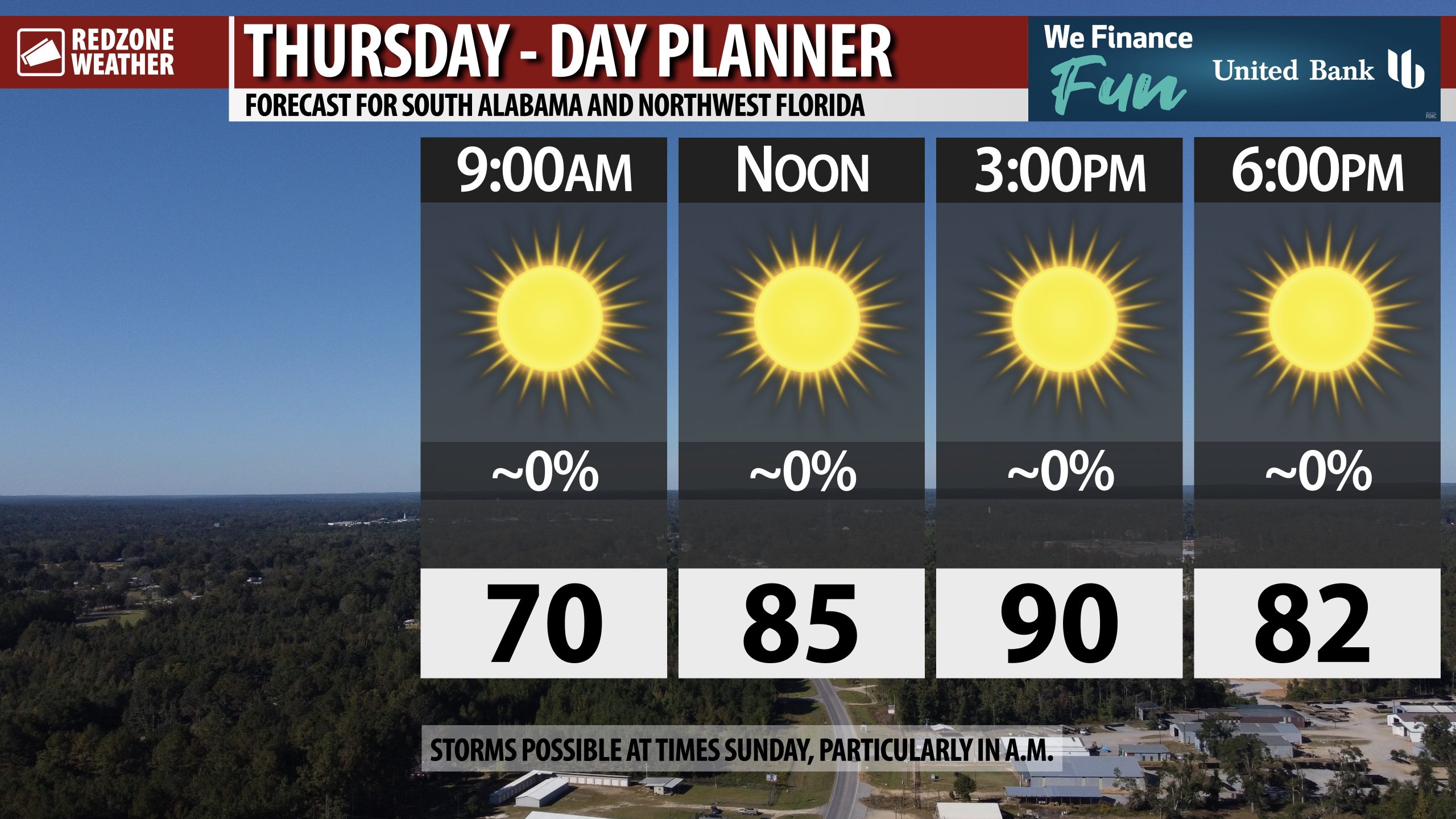 SUNNY THURSDAY; SPOTTY STORMS AT TIMES SATURDAY NIGHT INTO SUNDAY… Rain may be possible in some communities this weekend but before we get there, ample sunshine is expected across south Alabama and northwest Florida on this Thursday. High temperatures will be in the upper 80s and near the 90 degree mark. More dry weather is expected on Friday ahead of the potential for a few showers and storms late Saturday night into Sunday when a cold front will approach our region from the northwest.