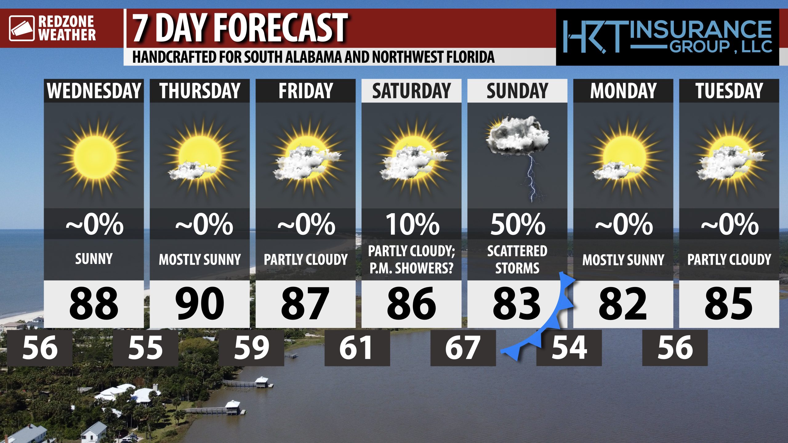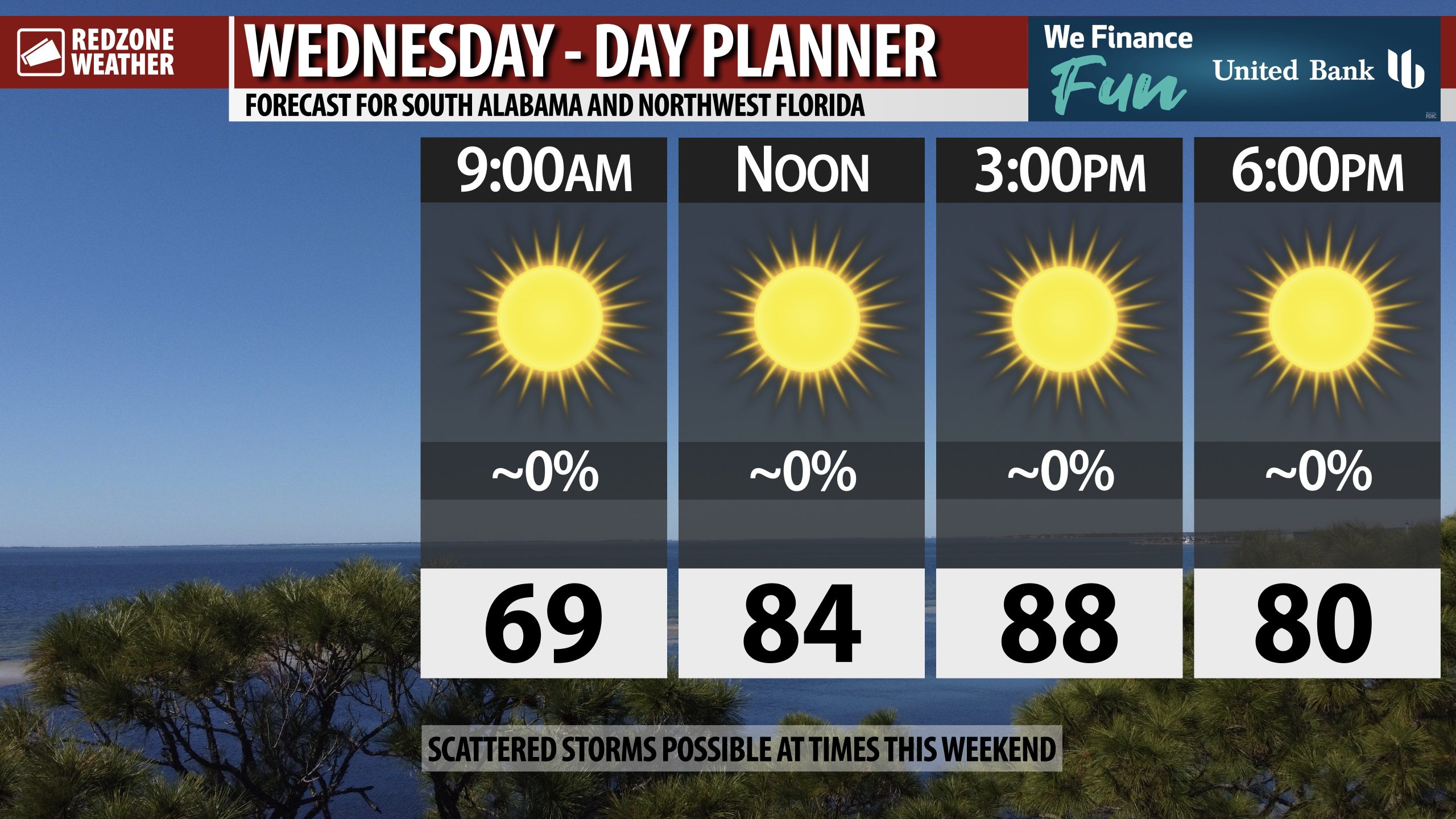 SUNNY, NICE WEDNESDAY; SCATTERED STORMS POSSIBLE SUNDAY… High temperatures will be in the upper 80s this afternoon with a full supply of sunshine expected throughout the day across south Alabama and northwest Florida on this Wednesday. Thursday and Friday will be dry days locally ahead of our next rain chance setting up late Saturday night into Sunday as a cold front approaches from the northwest. For now, the overall threat of any severe storms locally remains low, however, a few strong to severe storms may be possible during the daytime hours of Saturday to our northwest.