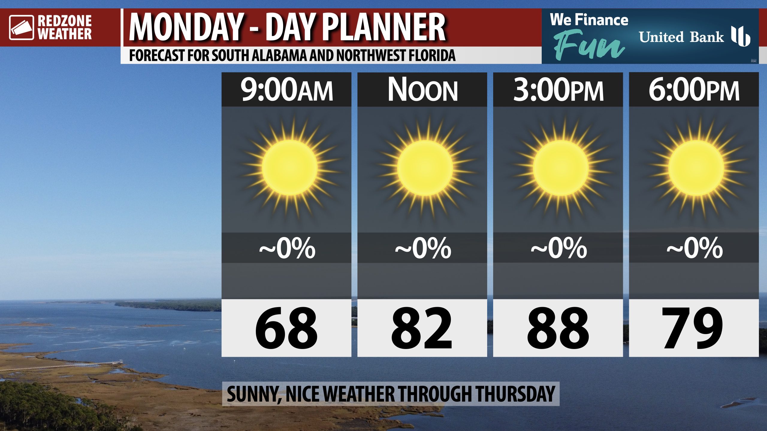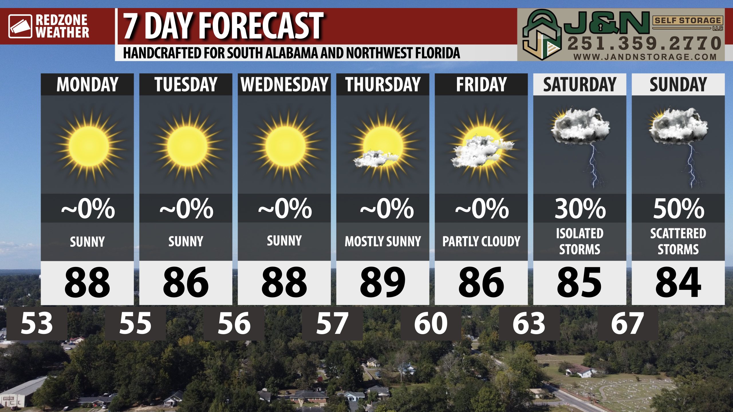 COOL MORNINGS, WARM DAYS THROUGH FRIDAY… Overnight lows will continue to be in the 50s tonight and again tomorrow night with low 60s likely in the nighttime hours later this week. Afternoon highs will be in the mid to upper 80s each day. Overall, a dry, pleasant weather pattern will be in place this week due to an upper ridge of high pressure in place across the Deep South.