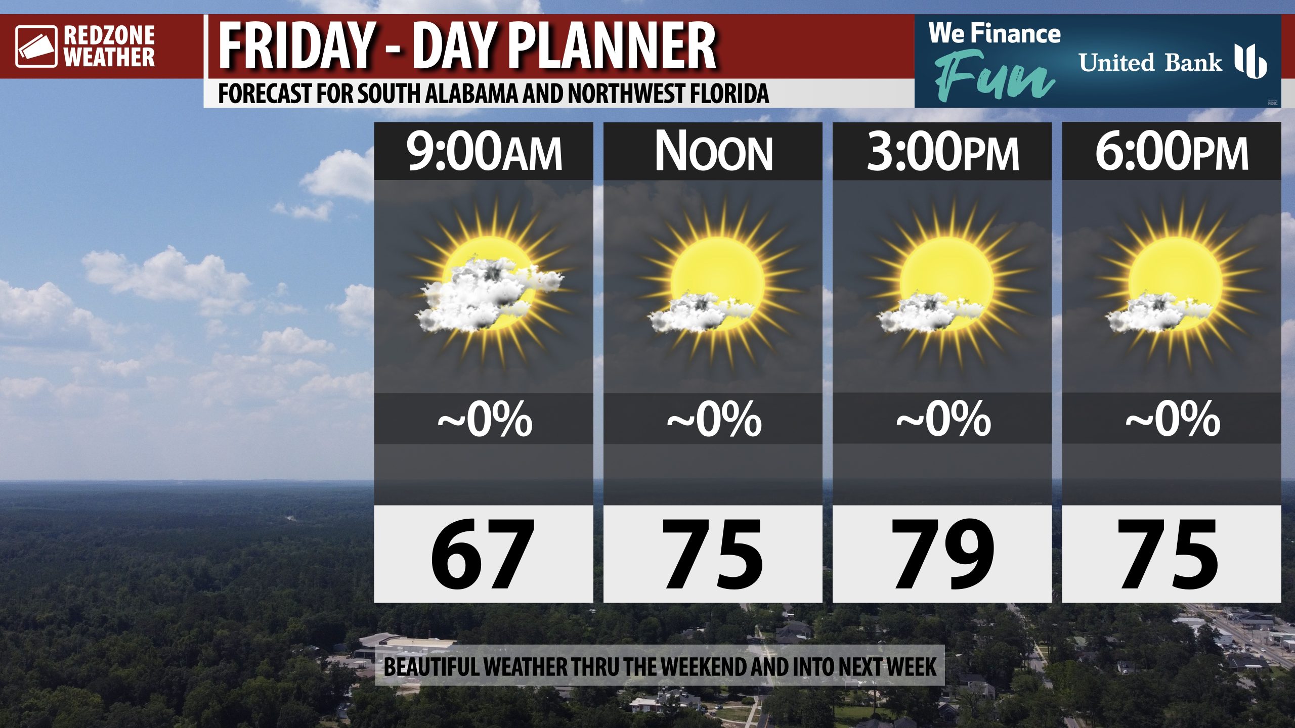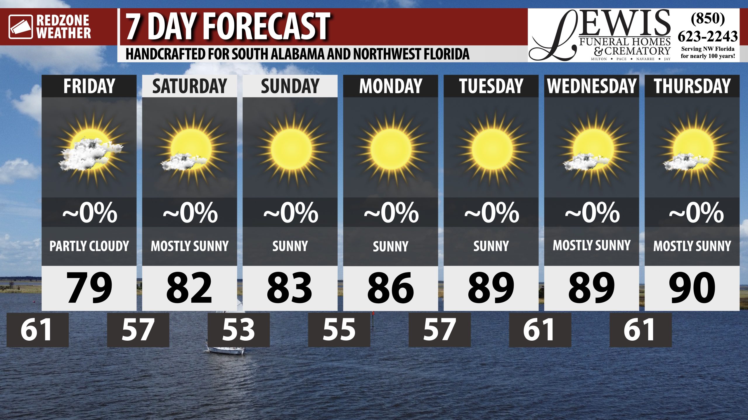 BEAUTIFUL WEATHER THIS WEEKEND AND INTO NEXT WEEK… Temperatures will increase progressively as we get into next week. We’ll start the week with highs in the low to mid 80s. By the end of next week, however, high temperatures will be around the 90 degree mark yet again. Overnight lows will be in the 50s and 60s early next week. No rain in the forecast across south Alabama and northwest Florida from Monday through Thursday.