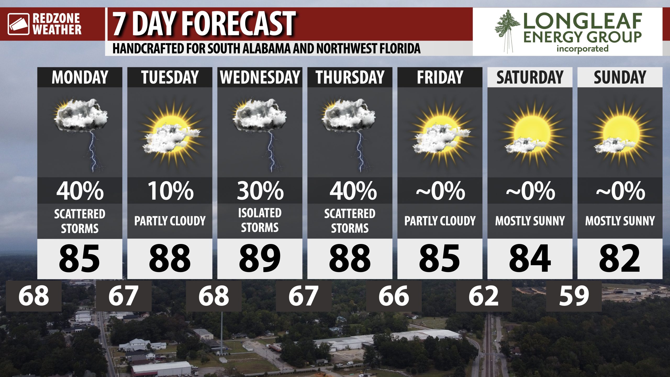 DRIER PATTERN THIS WEEKEND… Rain chances decrease significantly after Thursday. A cold front is expected to move through the Deep South later this week, specifically on Friday. This means slightly drier, cooler air will move into south Alabama and northwest Florida by Saturday and Sunday. High temperatures will be in the low 80s with morning lows in the upper 50s inland and low 60s closer to the coast.