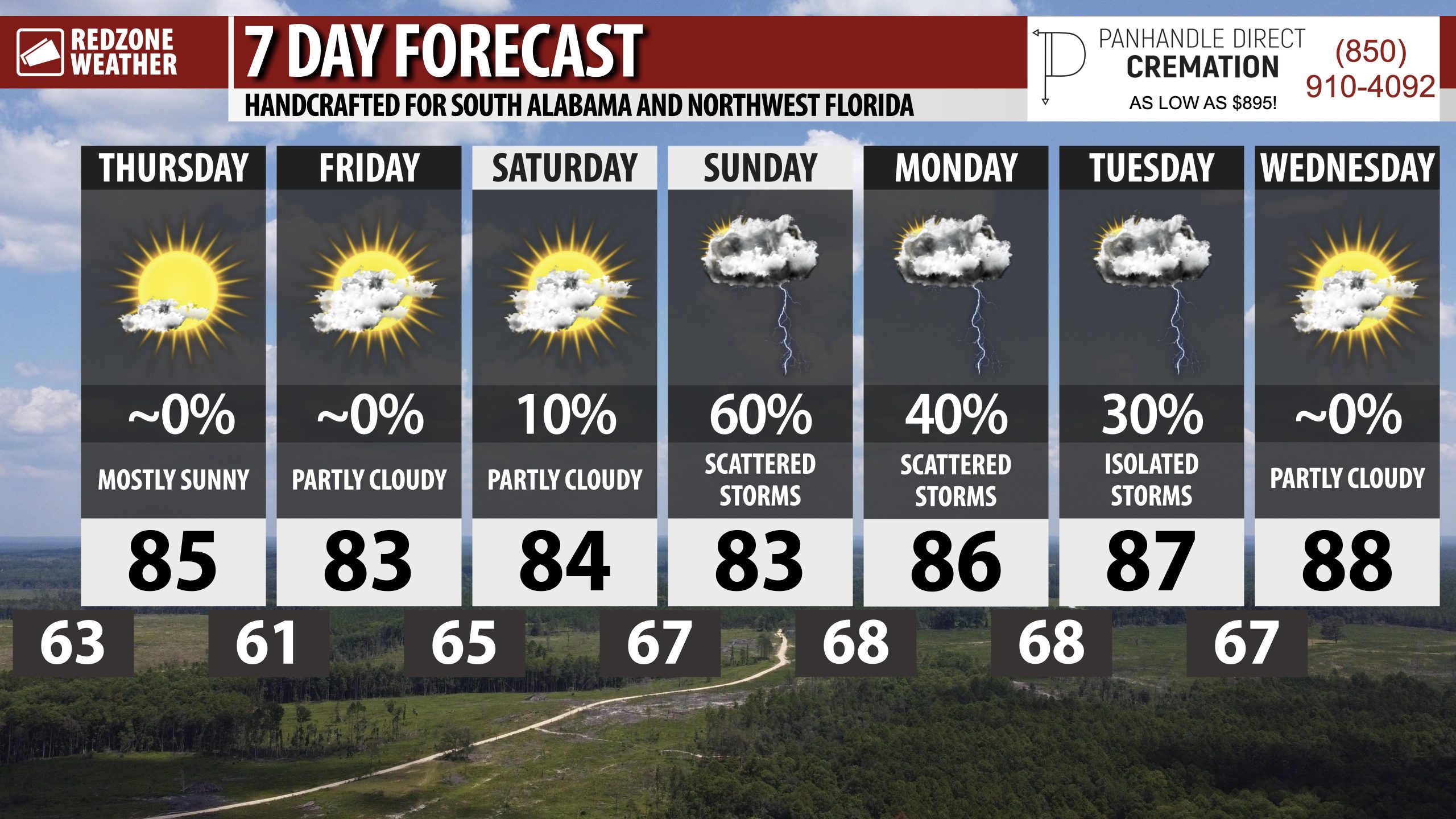 SLIGHTLY COOLER, DRIER AIR TODAY AND TOMORROW; RAIN & STORMS LIKELY SUNDAY… Mostly sunny, nice weather is expected across south Alabama and northwest Florida on this Thursday. High temperatures will be in the mid 80s in most communities across the region. There may be a few passing clouds, particularly this afternoon into this evening, but it will be a mostly sunny day across much of the local area. Tomorrow is slated to be dry and nice with slightly cooler temperatures ahead of increasing rain chances as we get into Sunday and Monday as a weak area of low pressure develops in the northern Gulf and pushes ashore. Thankfully, there is high confidence this system won’t develop into an organized, significant tropical system.