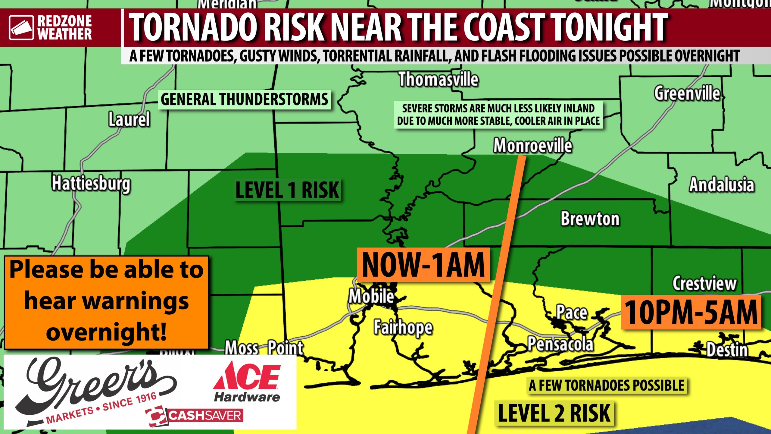 ROUND OF STORMS DEVELOPING NEAR COAST MAY CAUSE A FEW TORNADOES OVERNIGHT… Unfortunately, the expected Round 2 (of 2) of the strong to severe thunderstorms is materializing this evening across Mobile Bay, the Mississippi Sound, and the northern Gulf near Dauphin Island and Ft. Morgan. These storms will expand in size and very slowly translate to the east over the next several hours. The Storm Prediction Center now has a Level 2 (out of 5) tornado risk in place for much of Mobile, Baldwin, Escambia (FL), Santa Rosa, Okaloosa, and Walton counties, specifically the southern parts of these counties closer to the coast. These are the zones where the air mass in place is a bit more unstable and may support a few tornadoes in addition to very heavy rainfall. Everyone should have multiple ways to hear warnings before you go to sleep tonight, just in case a tornado warning is needed for your specific location!