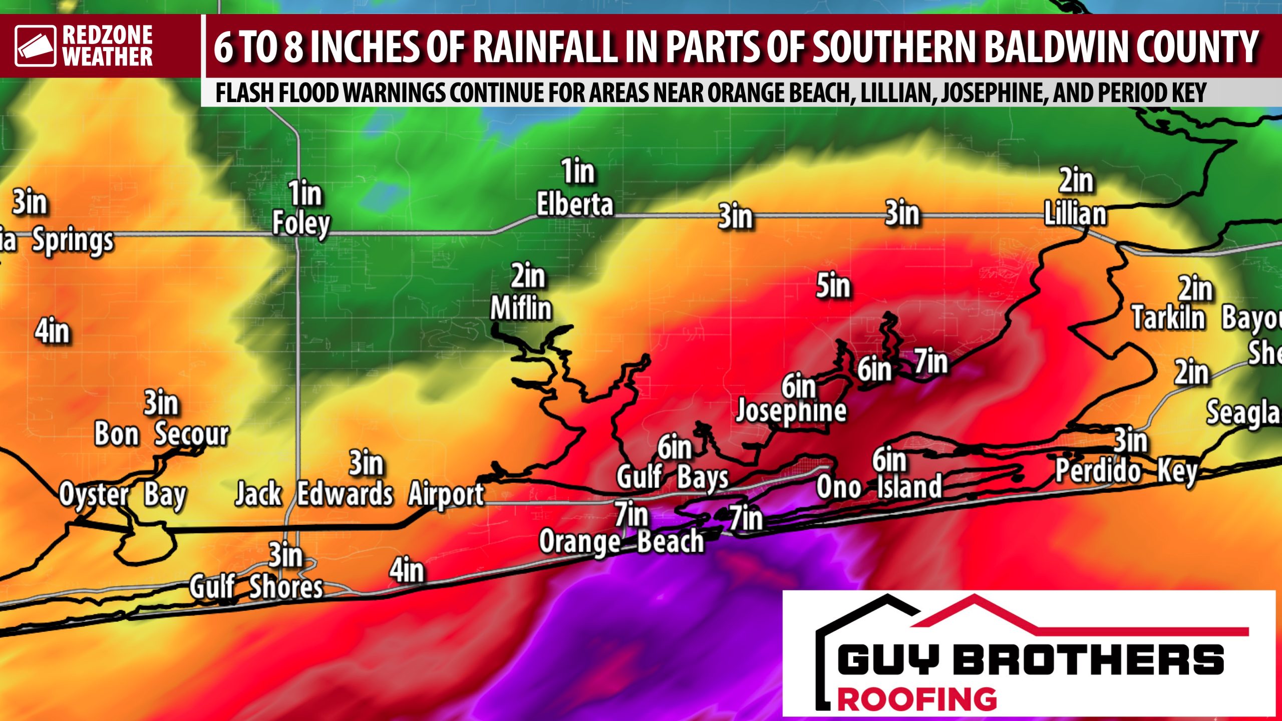 UPDATE ON SEVERE WEATHER RISK; FLASH FLOOD NEAR OBA… Ongoing rain across the region, particularly in southern Baldwin (AL) and Escambia (FL) counties, is making a serious flash flood situation even worse. 7.8 inches of total rainfall have happened so far today at the Orange Beach City Hall. 6.7 inches of total rain so far today at Ono Island. Multiple reports of flash flooding near Lillian have come in over the last few minutes. Rain amounts have generally been much more manageable everywhere else across the region, so far. Please let us know how much rain you have received!