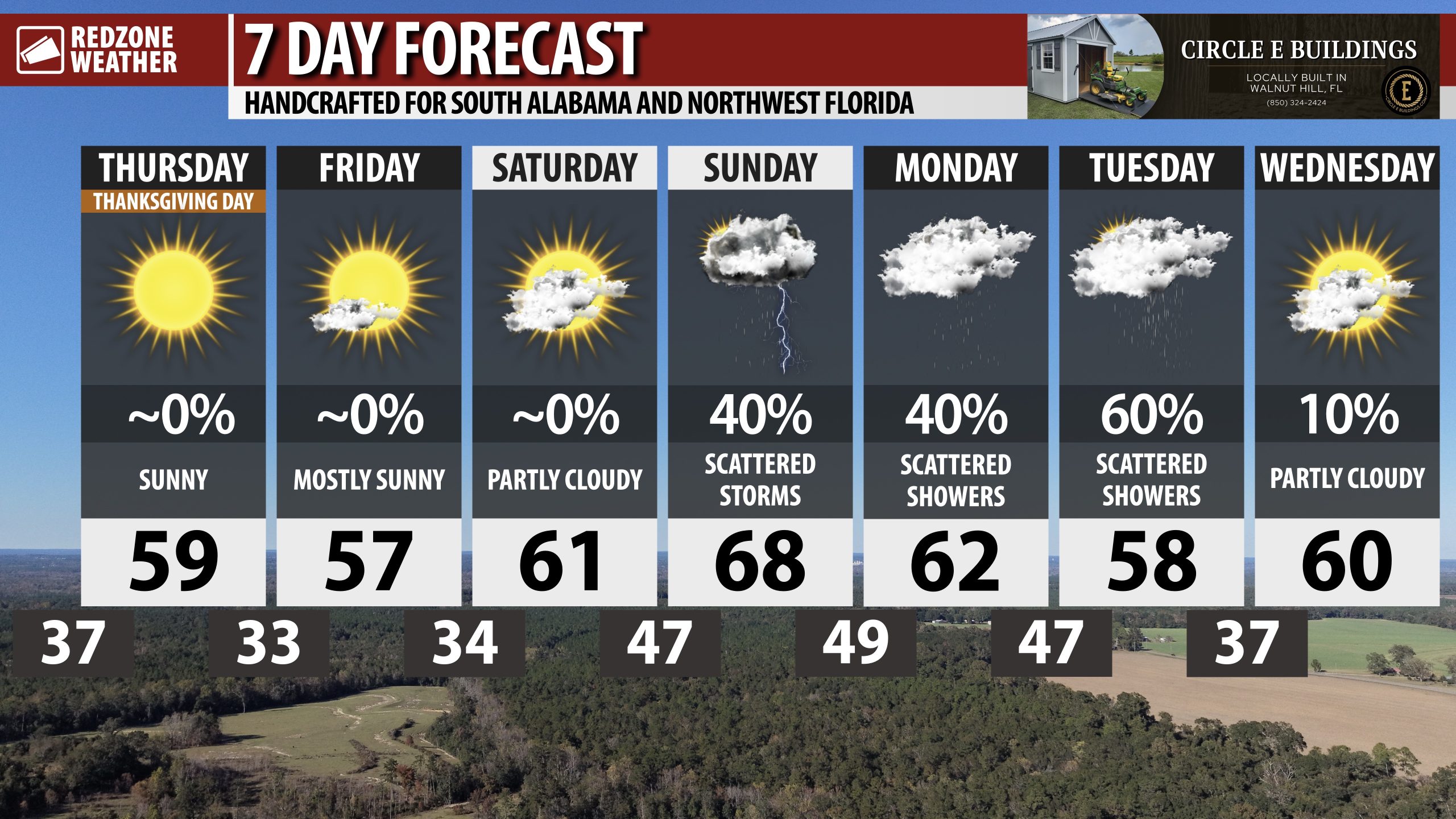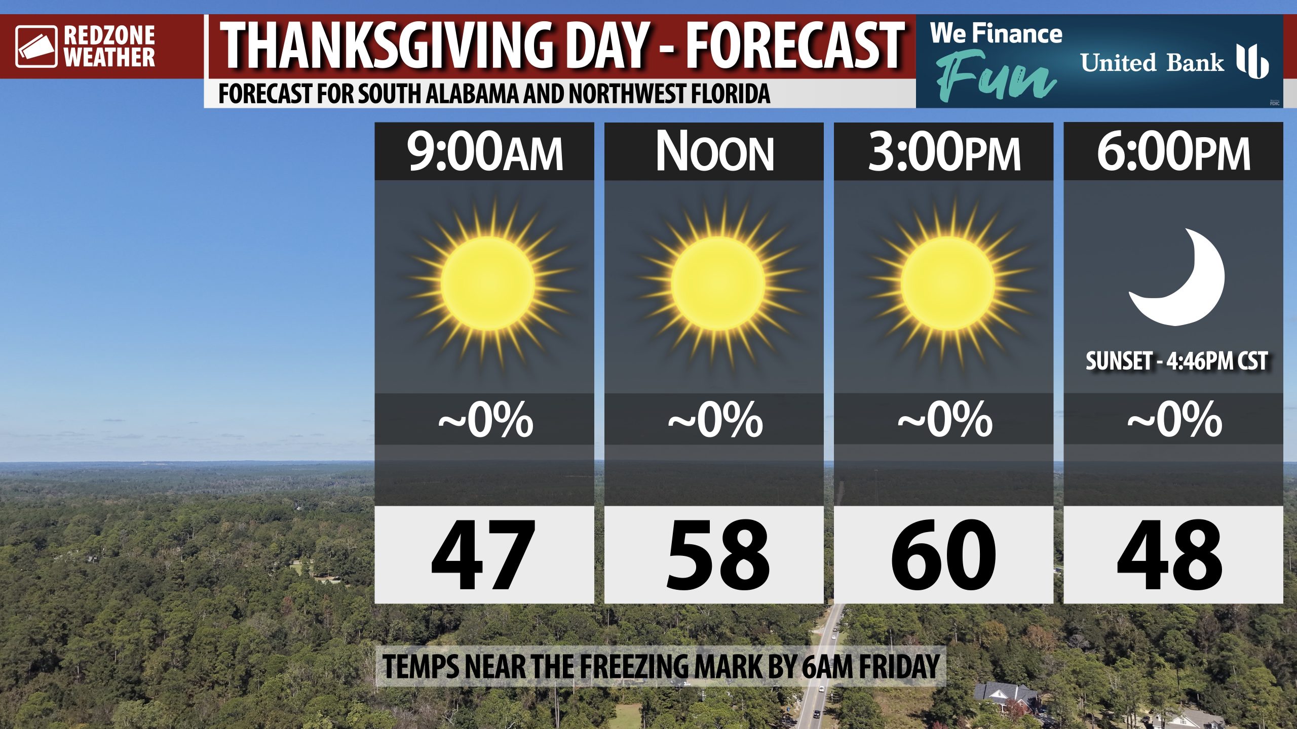 SUNNY, COOL THANKSGIVING DAY; RAIN RETURNS SUNDAY INTO MONDAY… Happy Thanksgiving to you, your family, and your friends! I am incredibly thankful for the opportunity to be your hometown meteorologist. We could not do what we do without the support of our RedZone Weather sponsors and our loyal audience. Thank you for watching. Plenty of sunshine is expected throughout the day. High temperatures will be in the upper 50s and near the 60 degree mark. The afternoon will be splendid with plenty of sunshine – perfect for any outdoor activities.