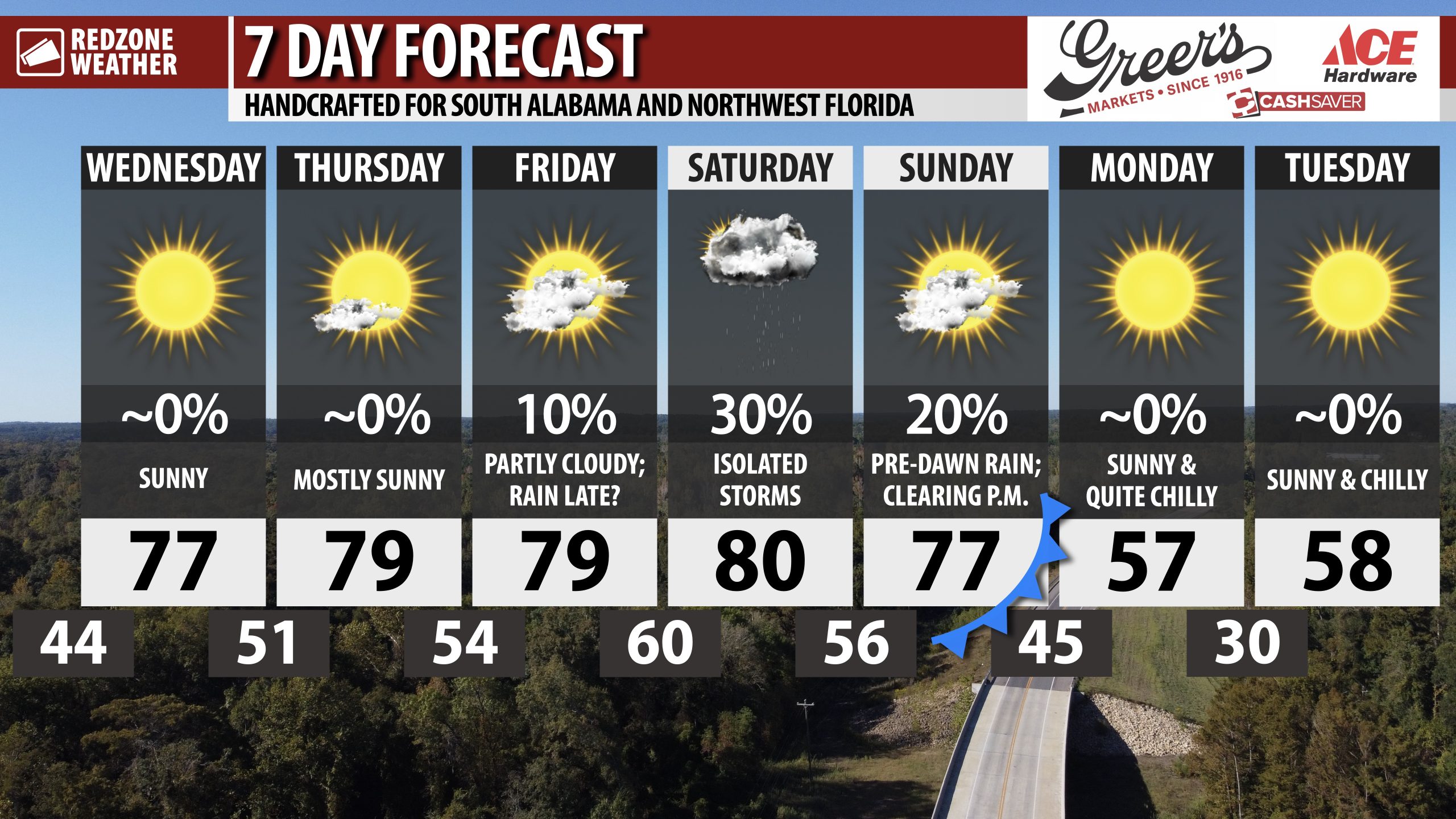 SIGNIFICANTLY COLDER AIR ARRIVES SUNDAY NIGHT INTO MONDAY… The coldest air of the season will invade the Deep South as we get into Sunday night after a strong cold front moves through. High temperatures on Monday will struggle to get beyond 55° with overnight lows expected to be in the 20s by the time we get to late Monday night and into Tuesday morning.