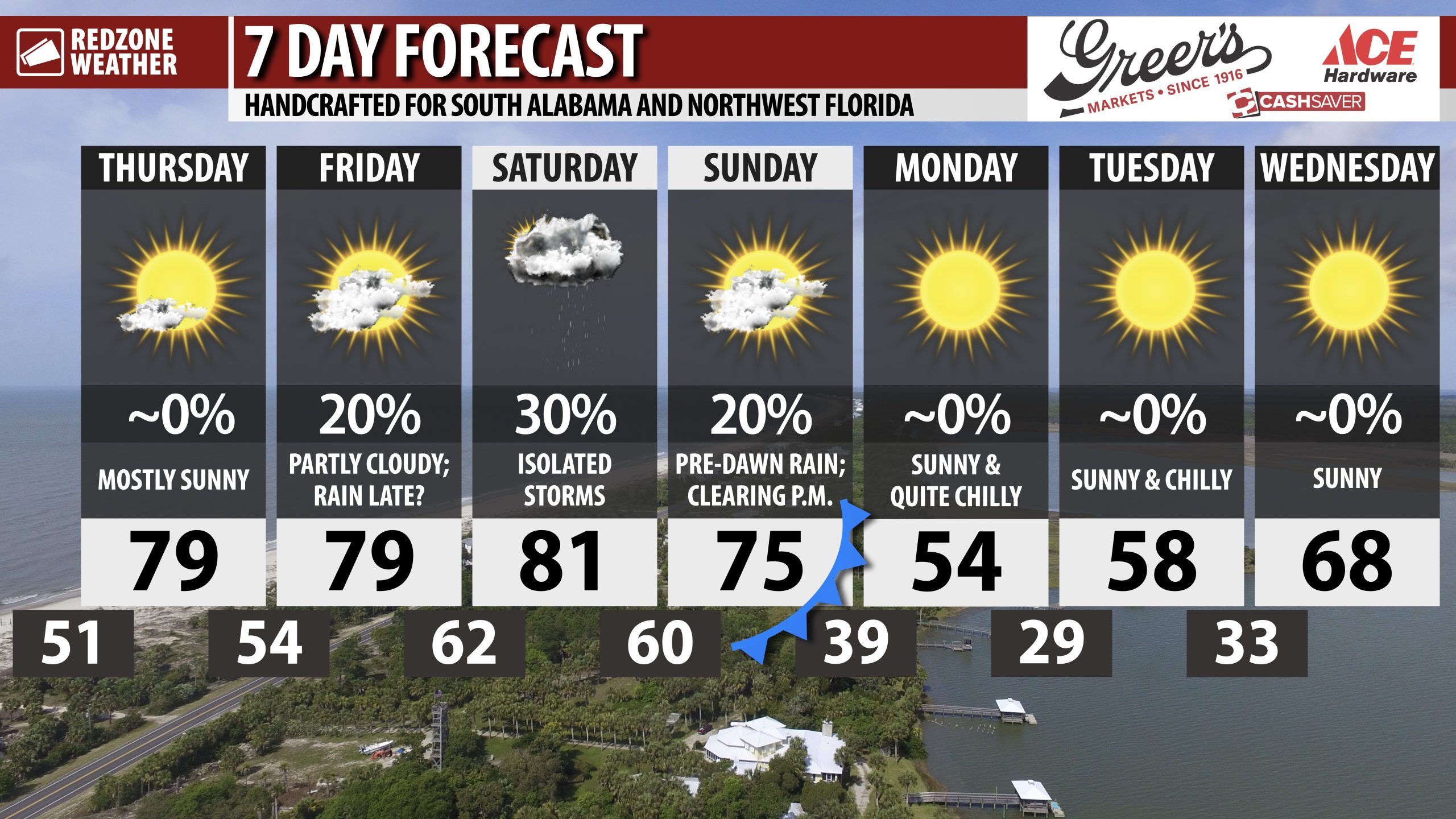 MORE SUNSHINE TODAY; STORMS POSSIBLE FRIDAY NIGHT AND INTO THIS WEEKEND… Temperatures will be slightly increased today compared to the last few days. Afternoon high temperatures will be in the mid to upper 70s across the region. We’re headed to the 40s again tonight for overnight lows. Looking ahead, our next chance of rain happens this weekend, most likely in the form of isolated or scattered showers and perhaps a few thunderstorms. The greatest chance of rain probably will happen on Saturday, but not every community across the local area will have rain before the end of the day. Before we get to Saturday, we may have a risk of a few isolated severe storms on Friday night. Much colder, drier air arrives early next week after the passage of a strong cold front.