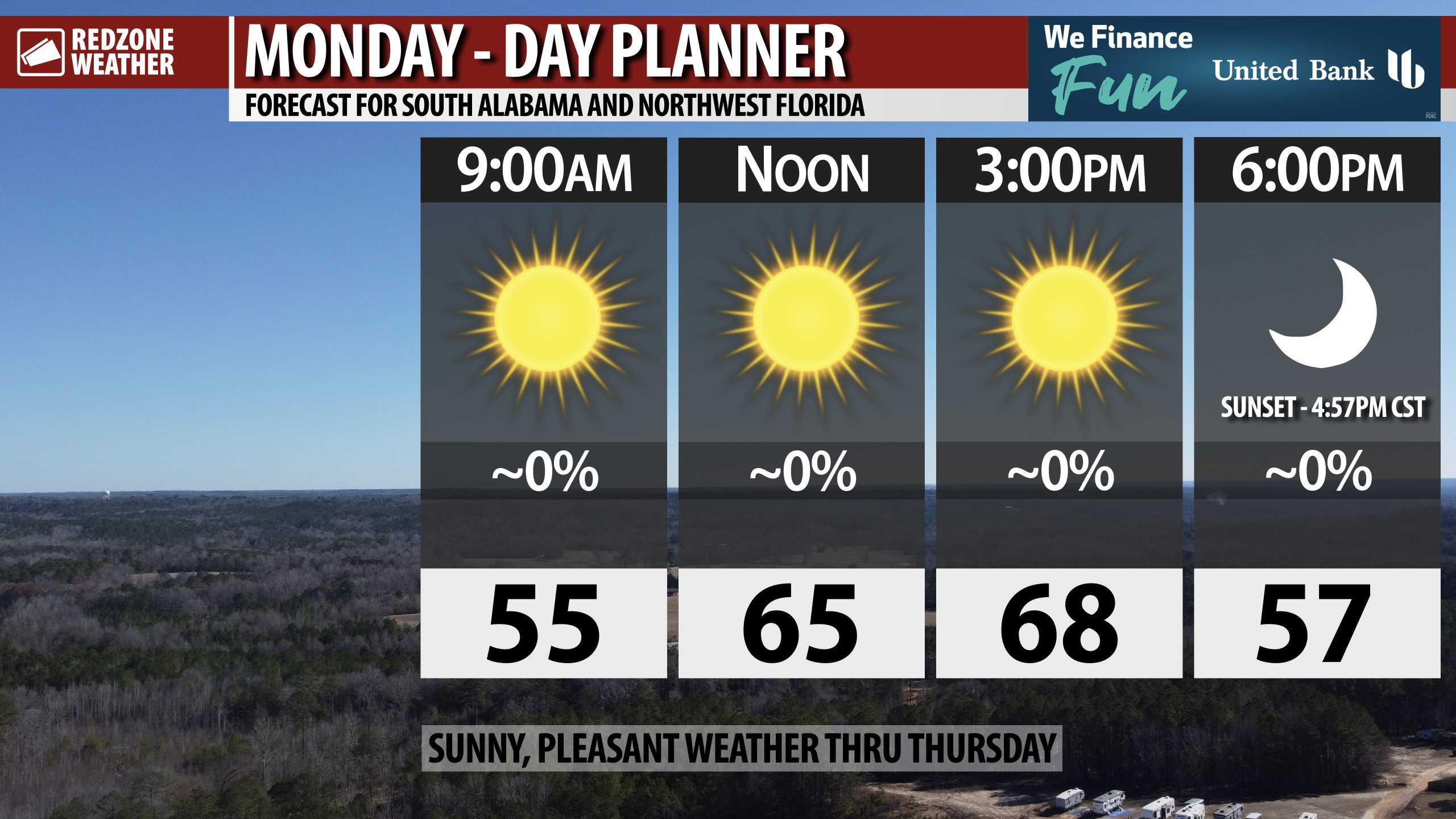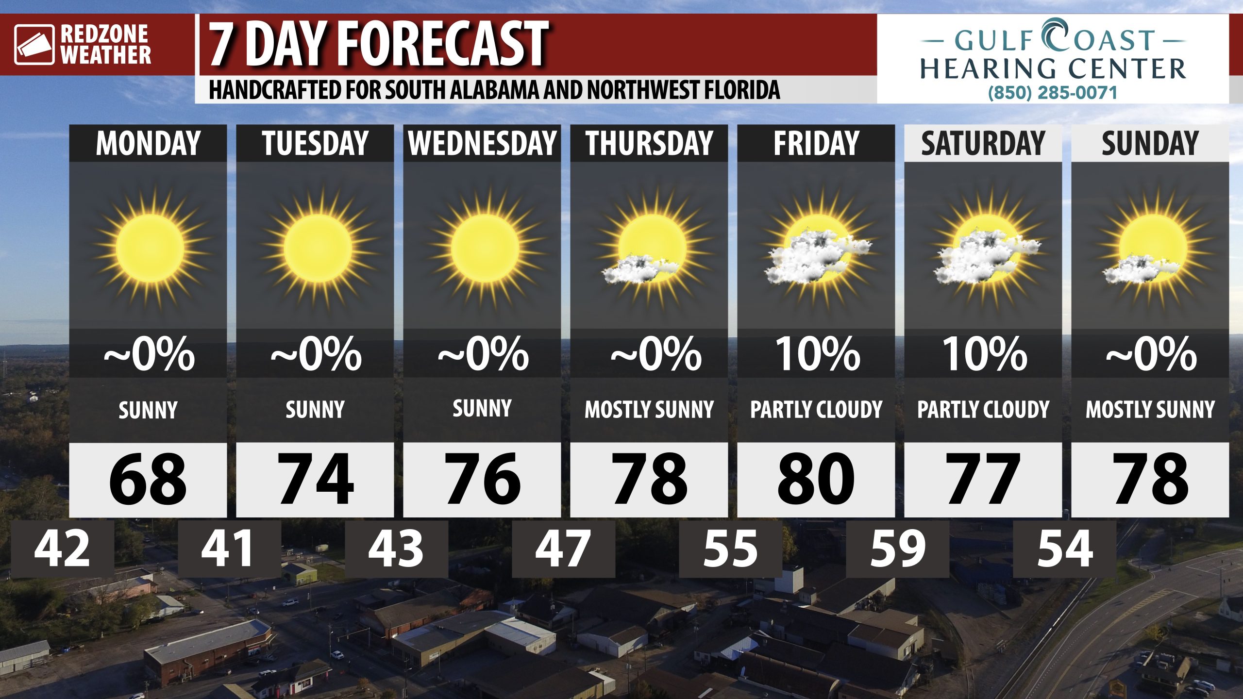 SUNNY MONDAY; MILD DAYS, COOL NIGHTS UPCOMING… Sunny, nice weather is expected today and tomorrow across south Alabama and northwest Florida. High temperatures will be upper 60s today. Tonight will be chilly, just like last night. Most locales will dip into the upper 30s inland with temperatures near 40° across a big chunk of the local area. Clear skies are expected overnight. Plenty of sunshine is likely on Tuesday, Wednesday, and Thursday, ahead of our next potential chance of rain on Friday and Saturday.