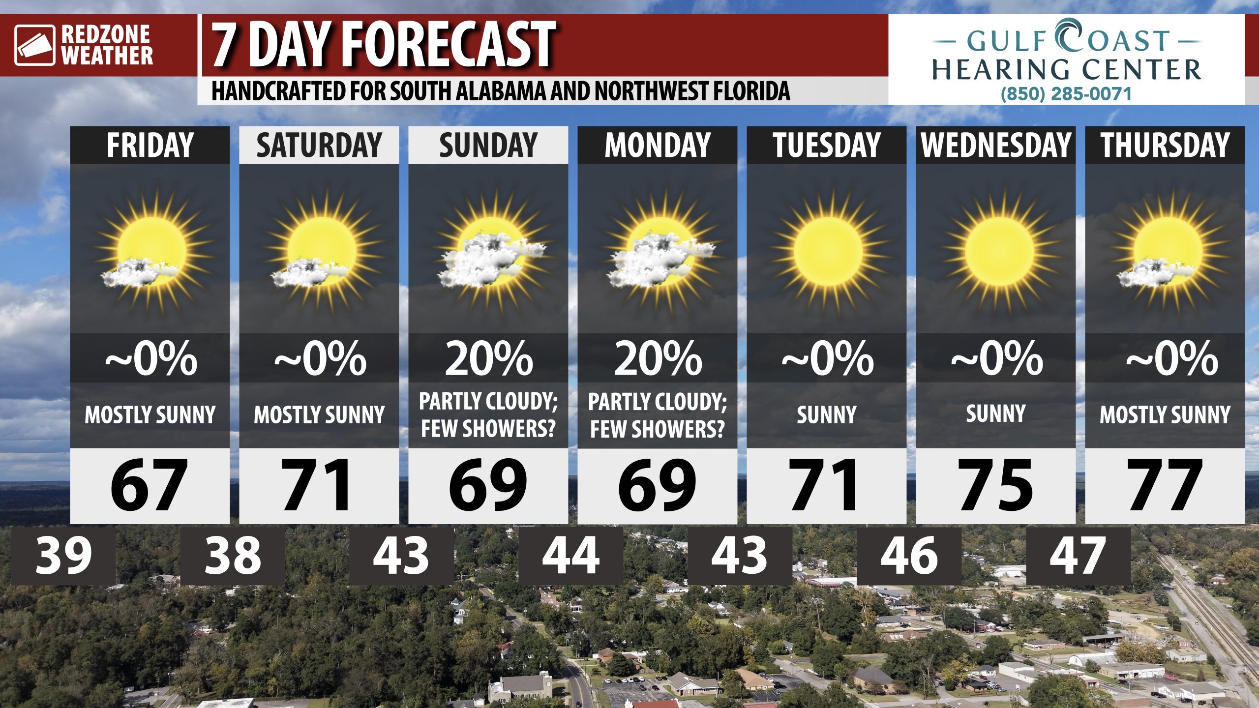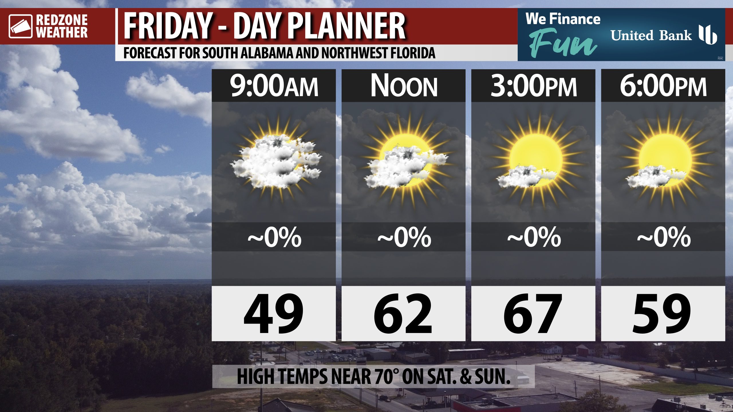 HIGHS NEAR 70° ON SATURDAY WITH PLENTY OF SUNSHINE… Tomorrow is expected to be a beautiful weather day across south Alabama and northwest Florida. Highs will be around the 70 degree mark with mostly sunny skies throughout the day.