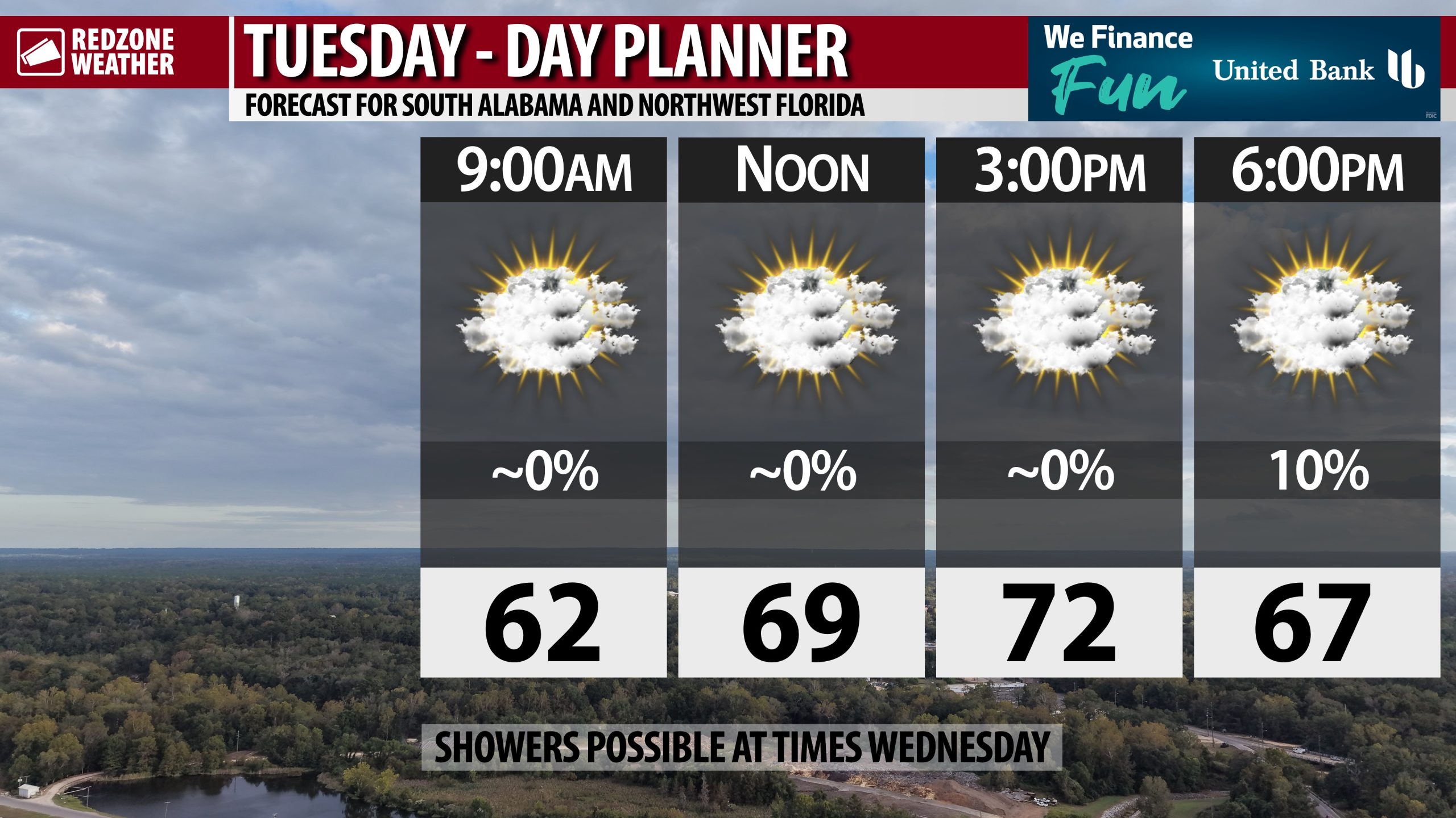 MOSTLY CLOUDY TUESDAY; RAIN POSSIBLE WEDNESDAY AHEAD OF COLD FRONT… Skies will remain mostly cloudy throughout the day on this Tuesday. I expect the daytime hours to be dry ahead of a chance of showers after sunset, specifically across parts of west Alabama. Most communities locally will remain dry until tomorrow morning when scattered showers will move in from the northwest. These showers will be moving just ahead of an advancing cold front that will cross our region on Wednesday. Much cooler temperatures arrive Wednesday night into Thursday.