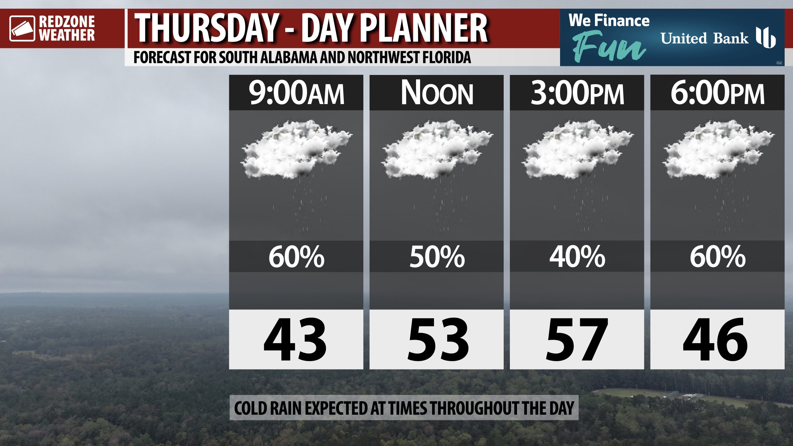 COLD RAIN AT TIMES TODAY, TOMORROW, AND SATURDAY… Beneficial rain will happen at times throughout the day on this Thursday across south Alabama and northwest Florida. Rain amounts in total over the next several days will be in the 1-3″ range across the region. Temperatures will be in the 40s all day inland with 50s likely closer to the coast. Temperatures won’t fluctuate much at all over the next several days due to near constant cloud cover and rain around at times. Overnight lows by 6AM Friday will be in the 40s. Highs tomorrow will again be in the low 50s.