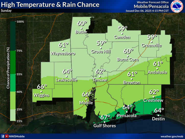 Posted inBlog 6:29AM December 7, 2025 Posted by spinks December 7, 2025 RAIN POSSIBLE AT TIMES TODAY… Isolated showers will be possible on this Sunday with high temperatures ranging from the upper 50s to the mid 60s. Drier weather likely starting tomorrow P.M. Post navigation Previous Post 2:38AM December 7, 2025