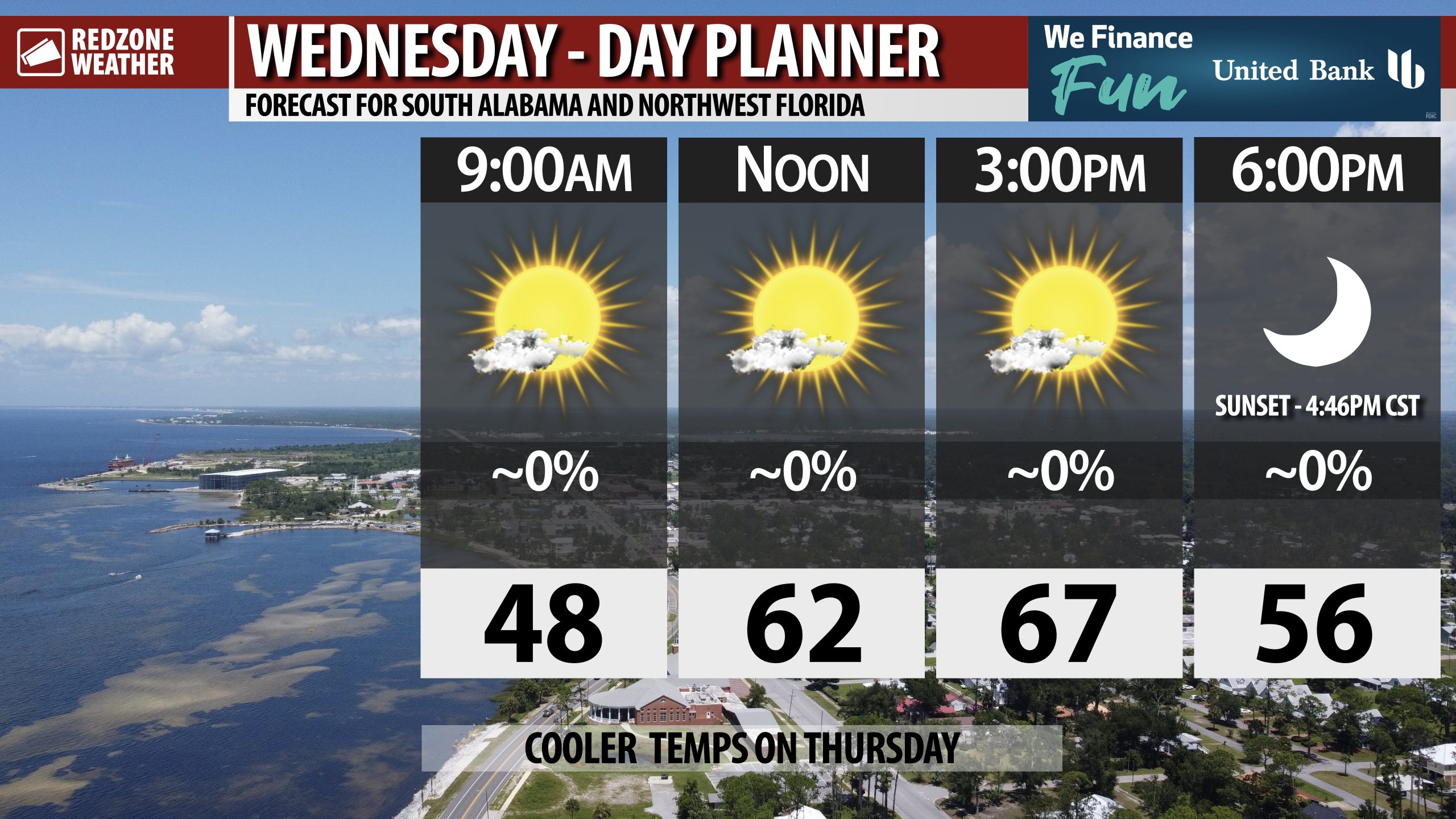 HIGH TEMPS IN 60s THIS AFTERNOON… Mild temperatures are expected this afternoon with highs in the upper 60s across south Alabama and northwest Florida. This will be the warmest day we have had in awhile.