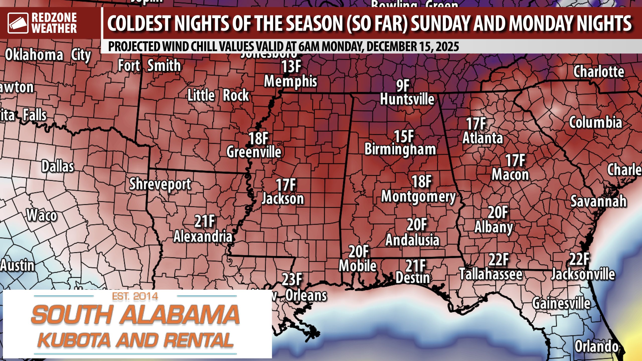 TWO VERY COLD NIGHTS TO HAPPEN SUNDAY NIGHT AND MONDAY NIGHT… Temperatures as low as 20 degrees with wind chill values in the upper 10s are expected Sunday night and Monday as the coldest air of the season arrives from the north. Interestingly, this will be a quick-hitting cold blast that will not last long at all. High temperatures tomorrow (Friday) and Saturday will be near the 70 degree mark. We’ll be in the 40s for afternoon highs by Monday with 60s likely again by Wednesday. While it won’t be a long duration cold event, air temperatures will dip into hard freeze territory on both Sunday night/early Monday morning and on Monday night/early Tuesday morning. The attached map highlights projected wind chill values at 6AM Monday morning.