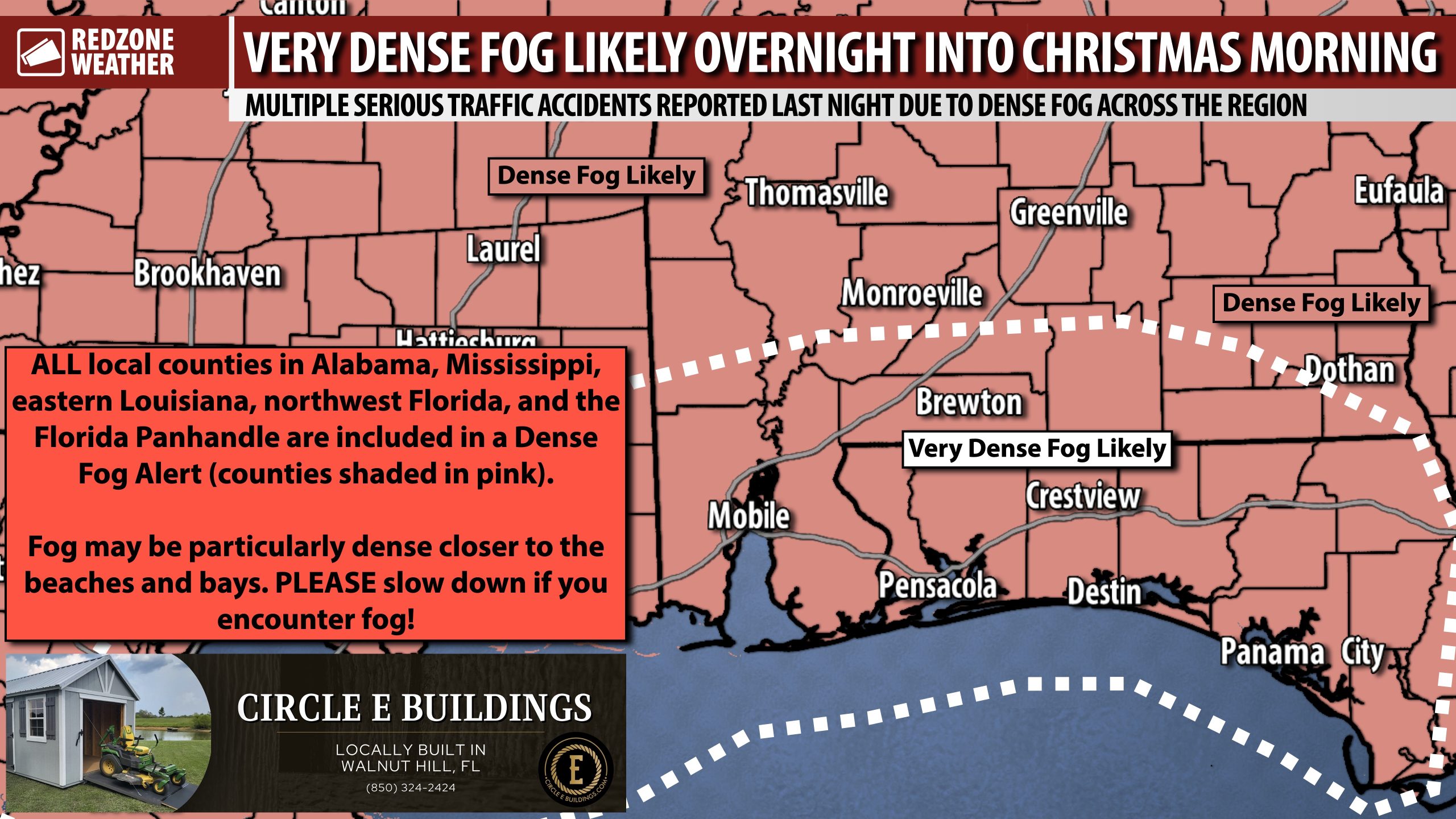 DENSE FOG CAUSED MULTIPLE SERIOUS ACCIDENTS LAST NIGHT; VERY DENSE FOG TONIGHT… Every county within 100 miles of south Alabama and northwest Florida is involved in a Dense Fog Alert overnight into Christmas Day morning. Dense fog will quickly become an issue later this evening in many communities across the region. If you have travel plans this evening, overnight, or into Christmas Day morning through 9-10AM, **please** slow down if you encounter foggy conditions. Fog will probably be the most dense between 3AM and 8AM. The greatest concern zone is south of US84 in places like Mobile, Daphne, Orange Beach, Foley, Pensacola, Atmore, Brewton, Andlausia, Opp, Florala, Milton, Pace, Jay, Walnut Hill, Century, Baker, Crestview, Niceville, Destin, Fort Walton Beach, Geneva, Panama City, Ponce De Leon, Port St. Joe, and Marianna.