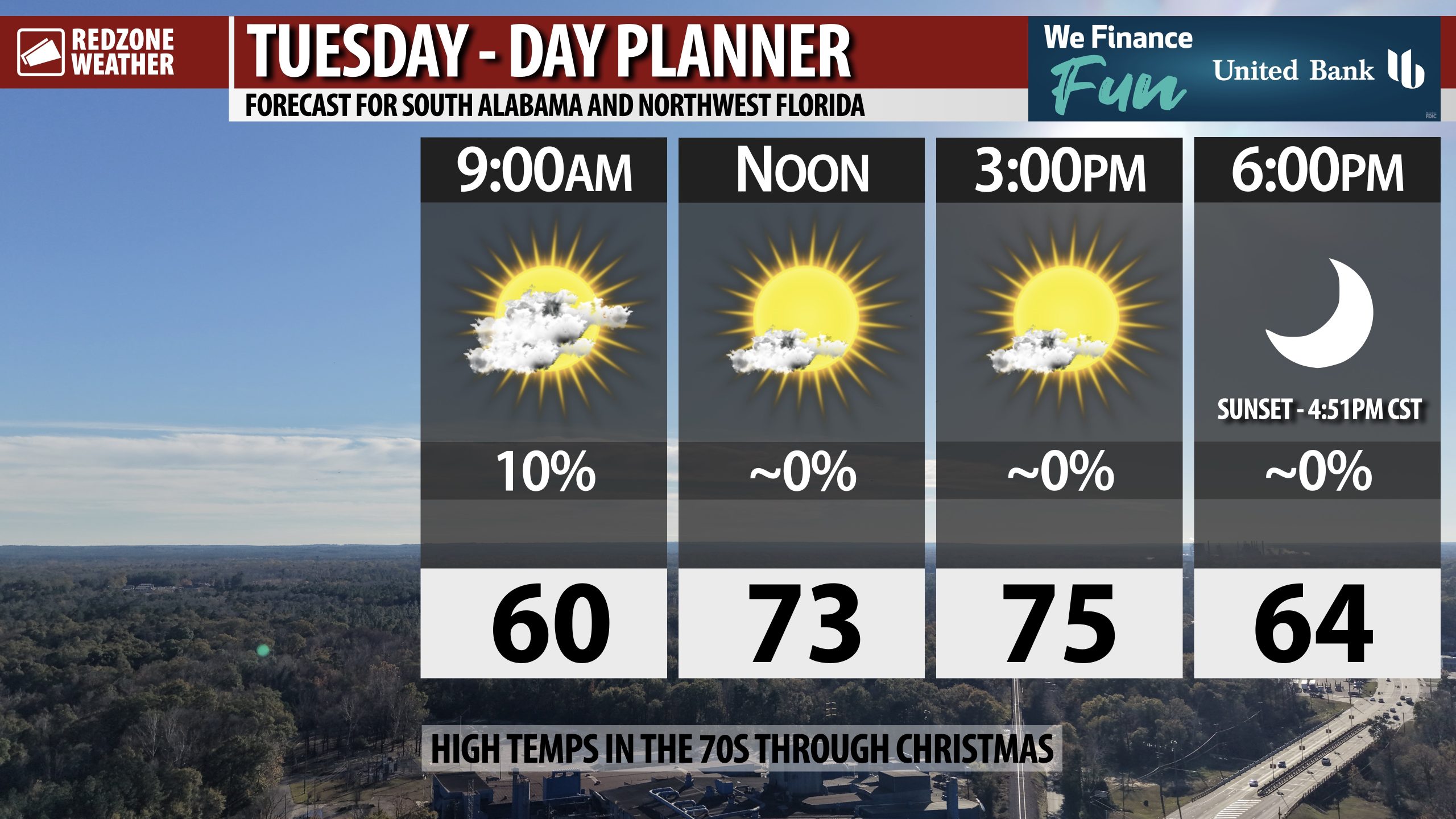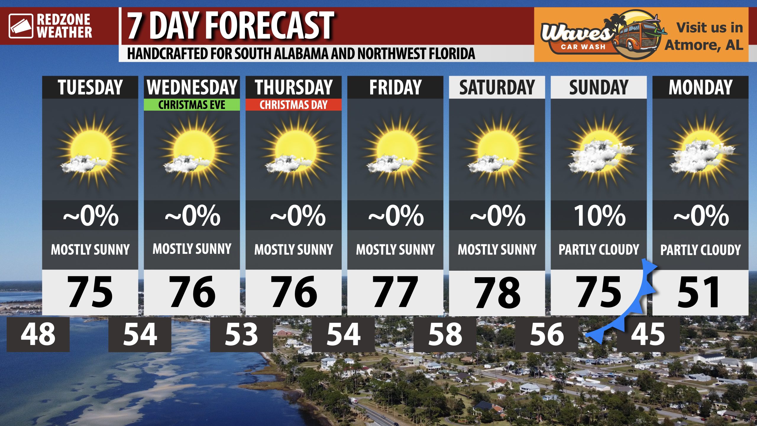 NICE AFTERNOONS AHEAD; MILD, DRY CHRISTMAS… Temperatures will peak in the mid 70s each day this week and into the weekend. If you’re headed out for some last minute Christmas shopping today, pleasant weather is expected across south Alabama and northwest Florida. Afternoon highs are projected to be in the mid 70s with mostly sunny skies as we get into the afternoon and early evening hours. Mild temperatures are likely as we get into Christmas Eve and Christmas Day. Sunset today happens at 4:51PM. Now that we have passed the Winter Solstice, the days are beginning to get longer once again. Sunset times will be after 5PM starting on January 6, 2026.
