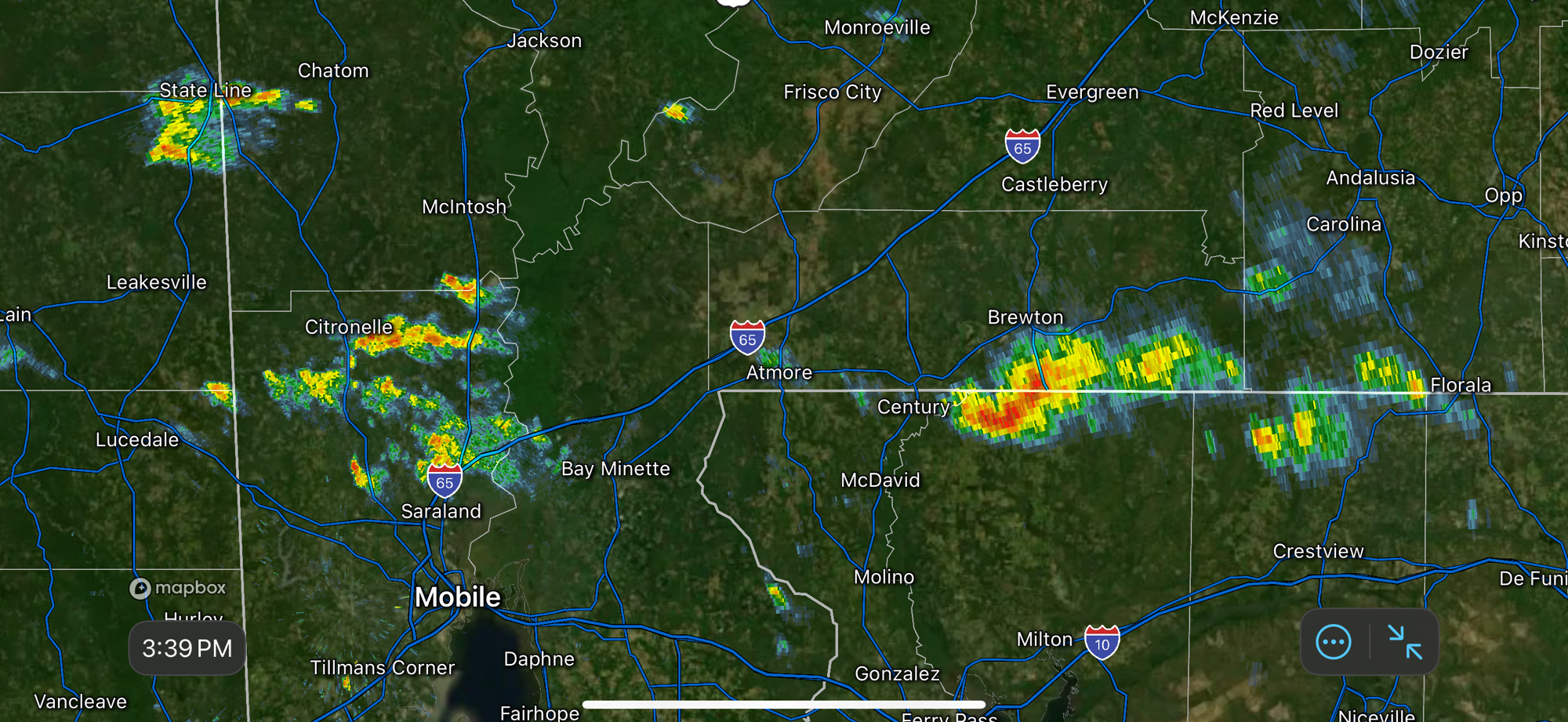 SCATTERED SHOWERS DRIFTING SOUTHEAST… Rain is happening near Dixonville, Mt. Carmel, Jay, Fidelis, Sellersville, Bradley, Escambia Farms, Laurel Hill, Creola, Axis, Citronelle, Calvert, and Mt. Vernon as of 3:48PM.
