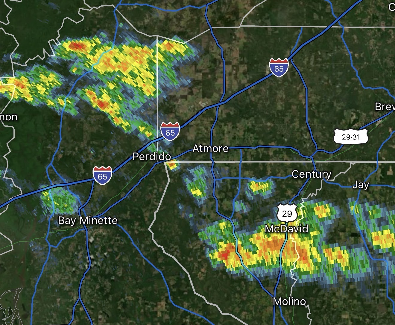 RAIN APPROACHING POARCH & ATMORE… Showers in northern Baldwin County are moving into western Escambia County, Alabama. Rain is likely to happen shortly near McCullough, Huxford, Poarch, Nokomis, and Atmore.