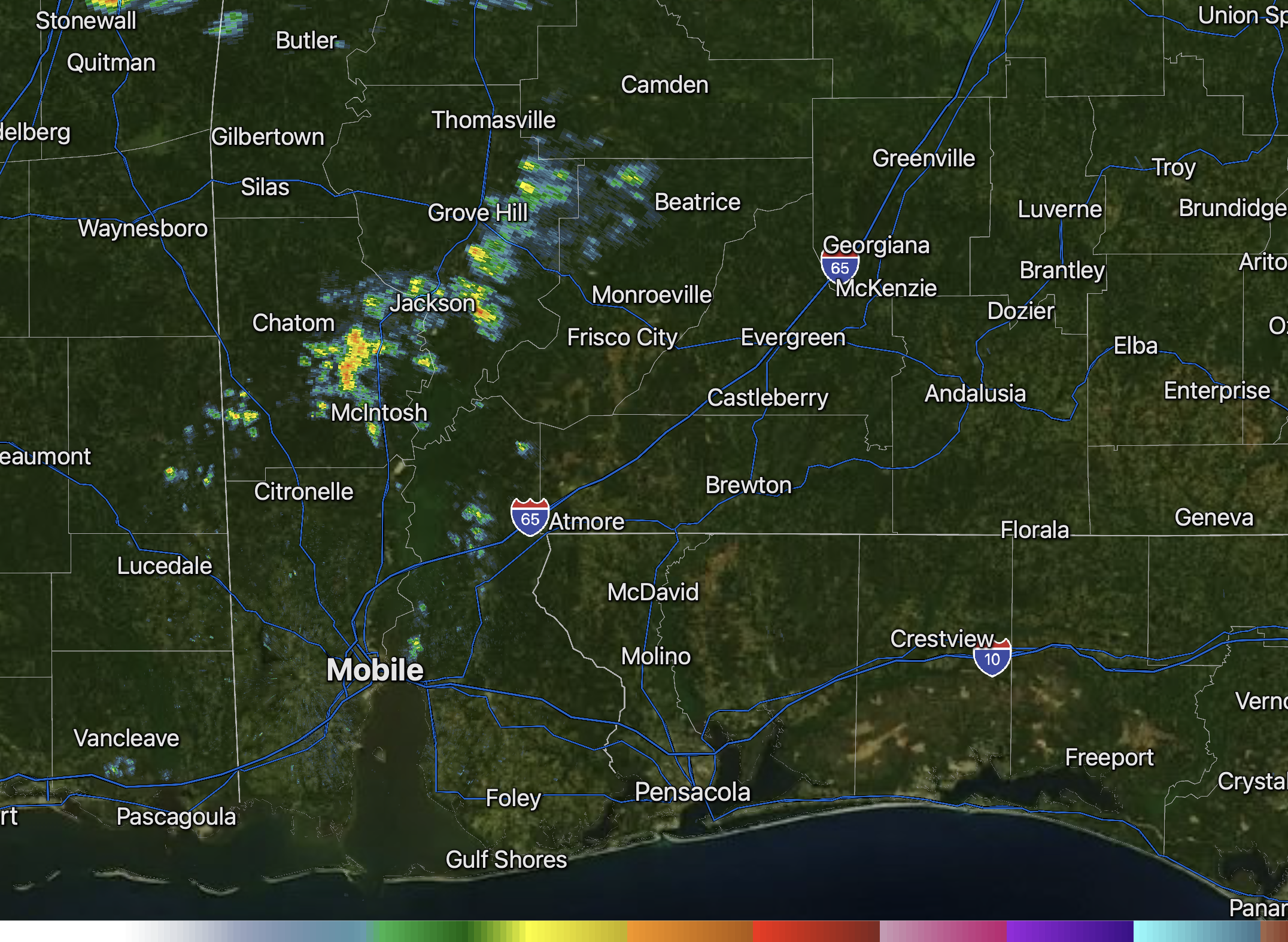 Spotty showers continue to develop and drift southeast across the region this afternoon. Rain is happening near Flomaton, Pineview, Keego, Pollard, Brooklyn, Bradley, Georgetown, Citronelle, and Calvert.