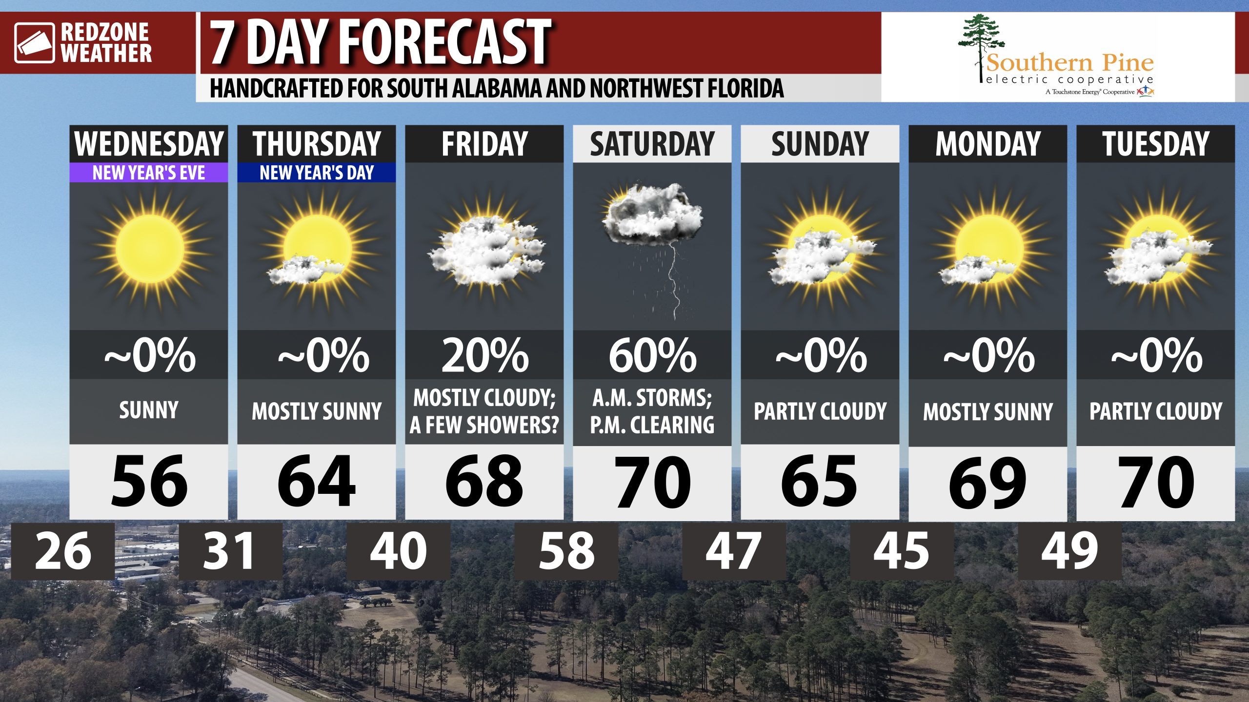 LAST DAY OF 2025 TO BE SUNNY; COLD TEMPS TO RING IN 2026 TONIGHT… The final day of 2025 will feature beautiful, sunny weather across south Alabama and northwest Florida. Plenty of sunshine is expected all day with afternoon high temperatures in the mid to upper 50s. Midnight festivities ringing in the New Year will be chilly with temperatures projected to be in the mid 30s around 12AM. We’ll be in the 30-32° range by daybreak tomorrow morning. Freezing temperatures will be long gone by the time our next rain chance arrives on Friday night into Saturday. Scattered thunderstorms may become possible Saturday morning with potentially a low-end risk of a few stronger storms.
