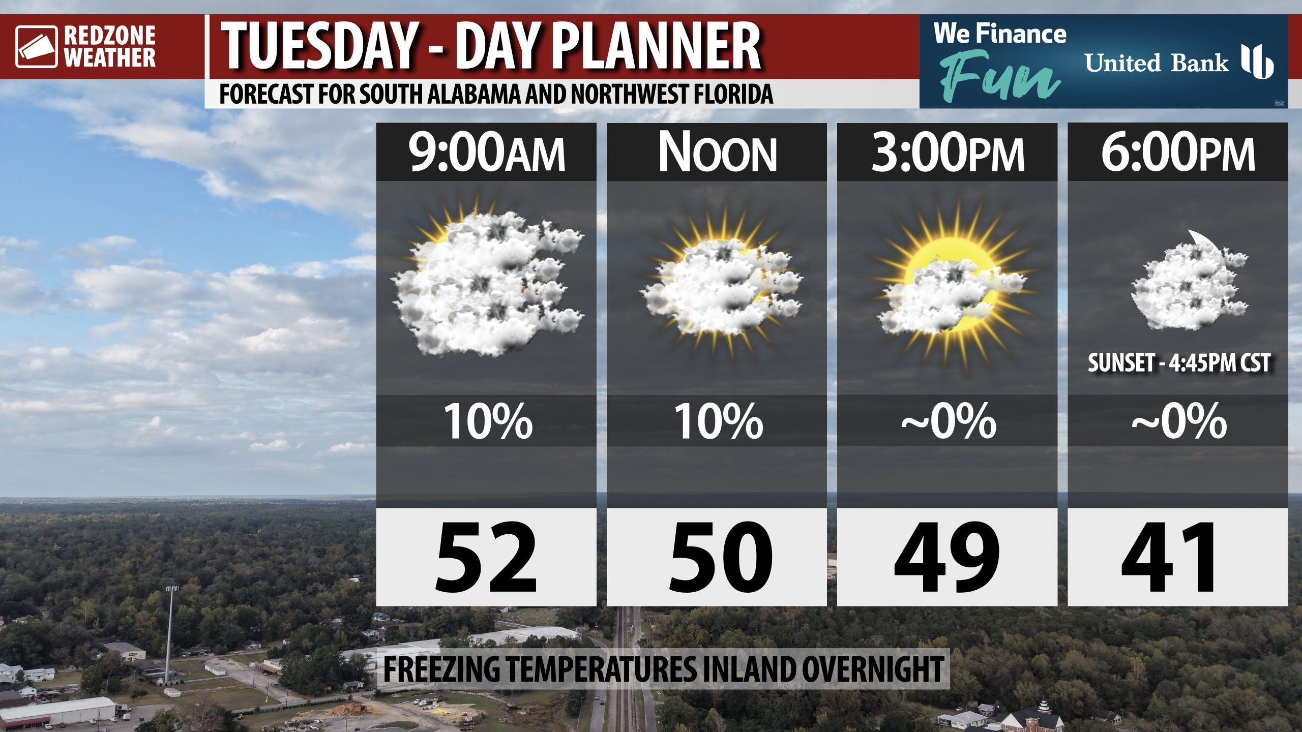 RAIN TO CONTINUE OVERNIGHT; LOW-END RISK OF A FEW STRONG STORMS NEAR N.W. FLORIDA COAST… Who is thankful for the rain we are having tonight across the region?! I certainly am. Rain will continue into the overnight hours and clear out to the east early tomorrow morning. Before we get there, we may have a few stronger storms develop near the northwest Florida coast overnight. It isn’t a “slam dunk” that we will have any severe storms, but the risk is such that a tornado or two wouldn’t be completely surprising IF a warm front can reach the northwest Florida coast overnight, likely between 11PM and 5AM. To be clear: NO tornado risk exists further inland as the air is much more stable and cool. This is a limited risk that may not come to fruition at all. Most of us will simply have rain and general thunderstorms at times overnight.