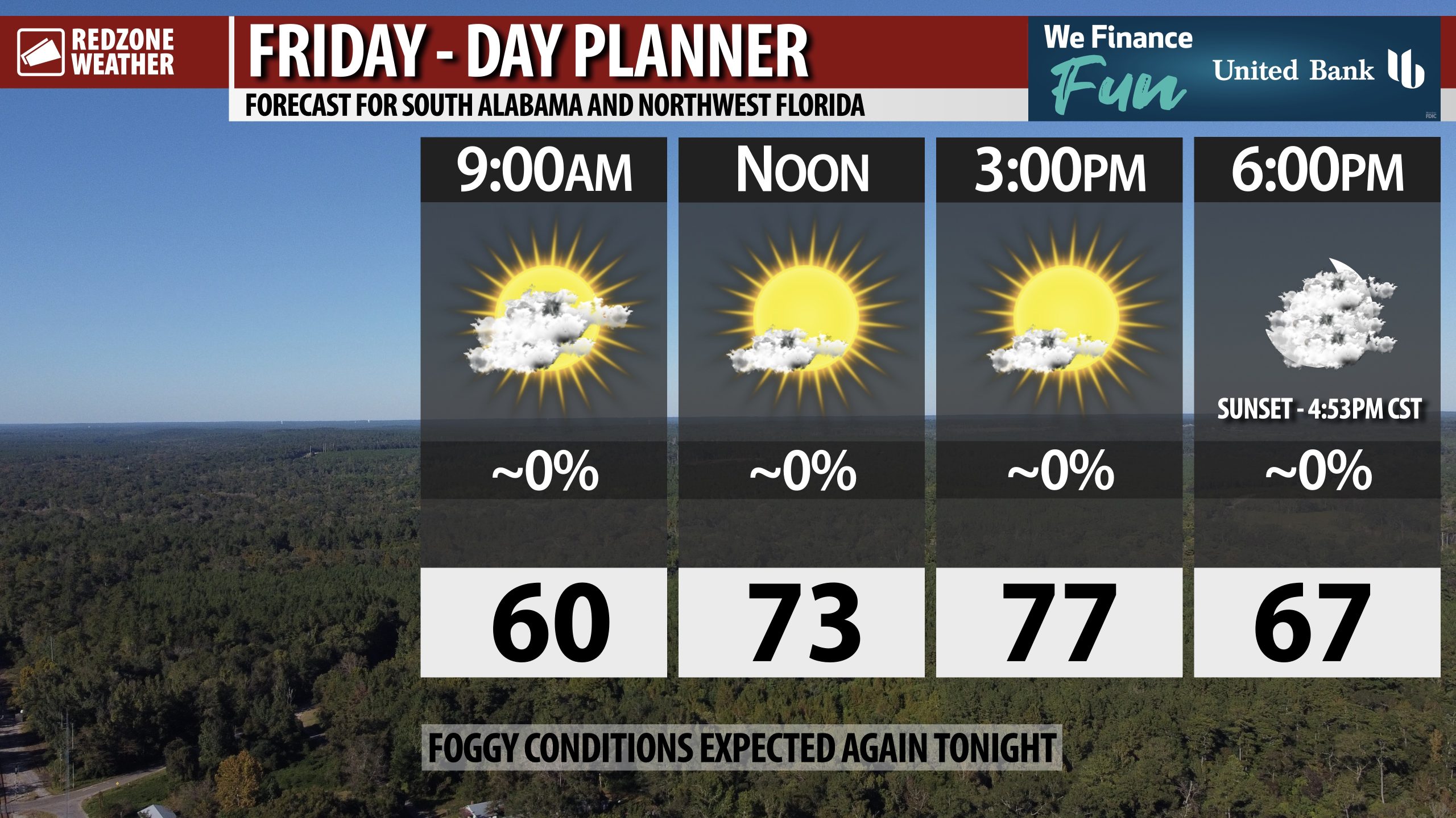 FOGGY MORNING; MAINLY SUNNY LATER TODAY… Dense fog is in place in some communities across south Alabama and northwest Florida this morning. Take it slow if you’re driving over the next several hours.