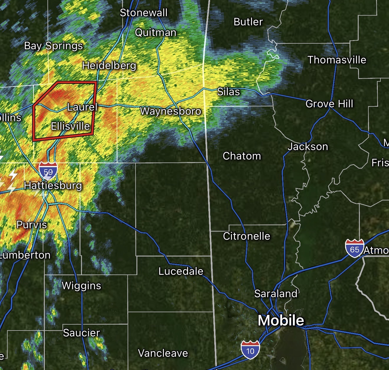 STORMS IN SOUTHEAST MISSISSIPPI… Thunderstorms that have prompted intermittent tornado warnings over the last couple of hours across parts of southeast Mississippi will likely weaken on approach to west Alabama. Why? Much lower instability across west AL, for now.