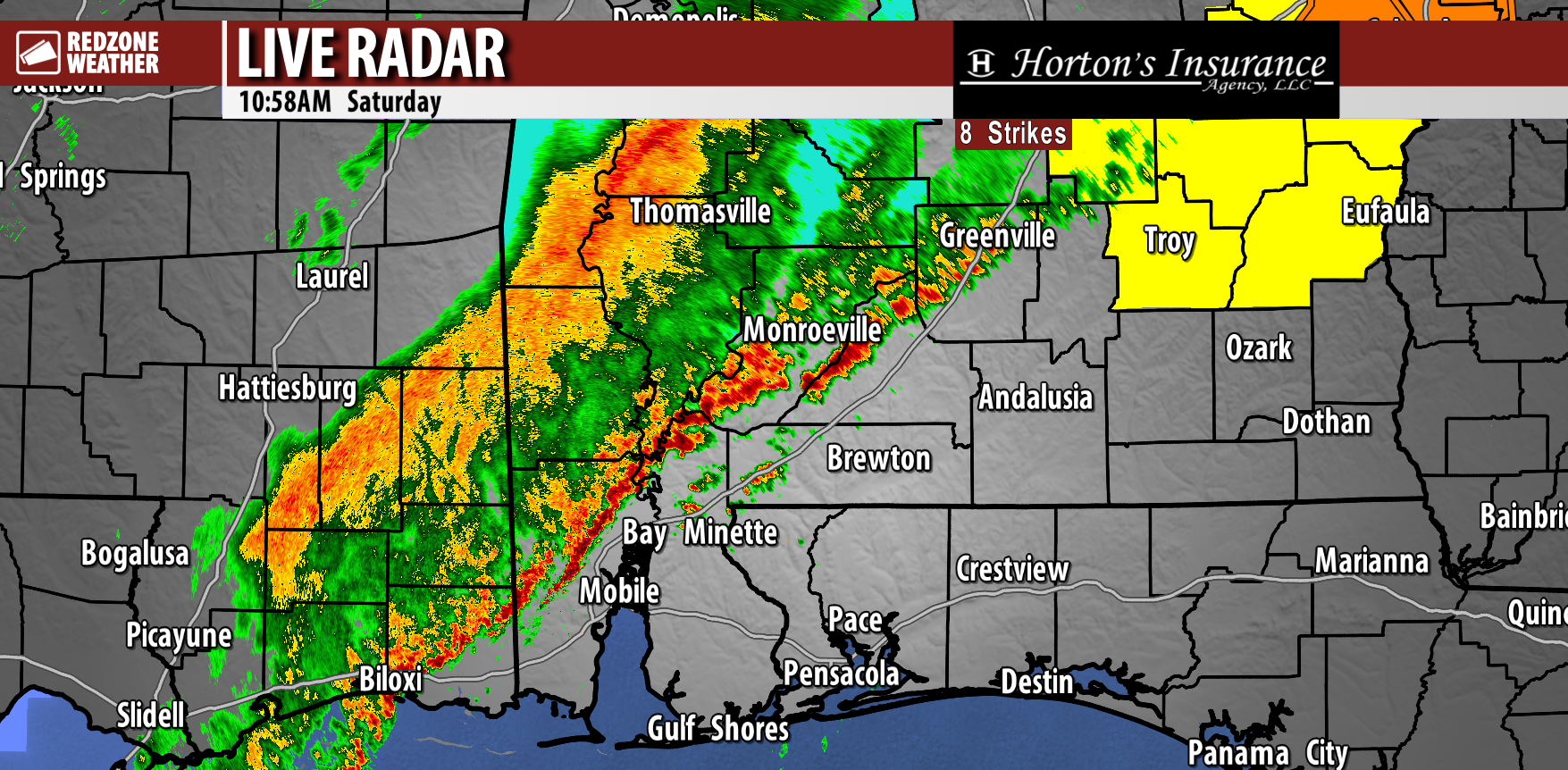 RAIN & STORMS SLOWLY MOVING EAST… Scattered thunderstorms continue to slowly advance eastward on this Saturday. Heavy rain is happening near Burnt Corn, Nichburg, Belleville, Repton, Megargal, Excel, Chrysler, Blacksher, Chastang, Mauvilla, and Tanner Williams.