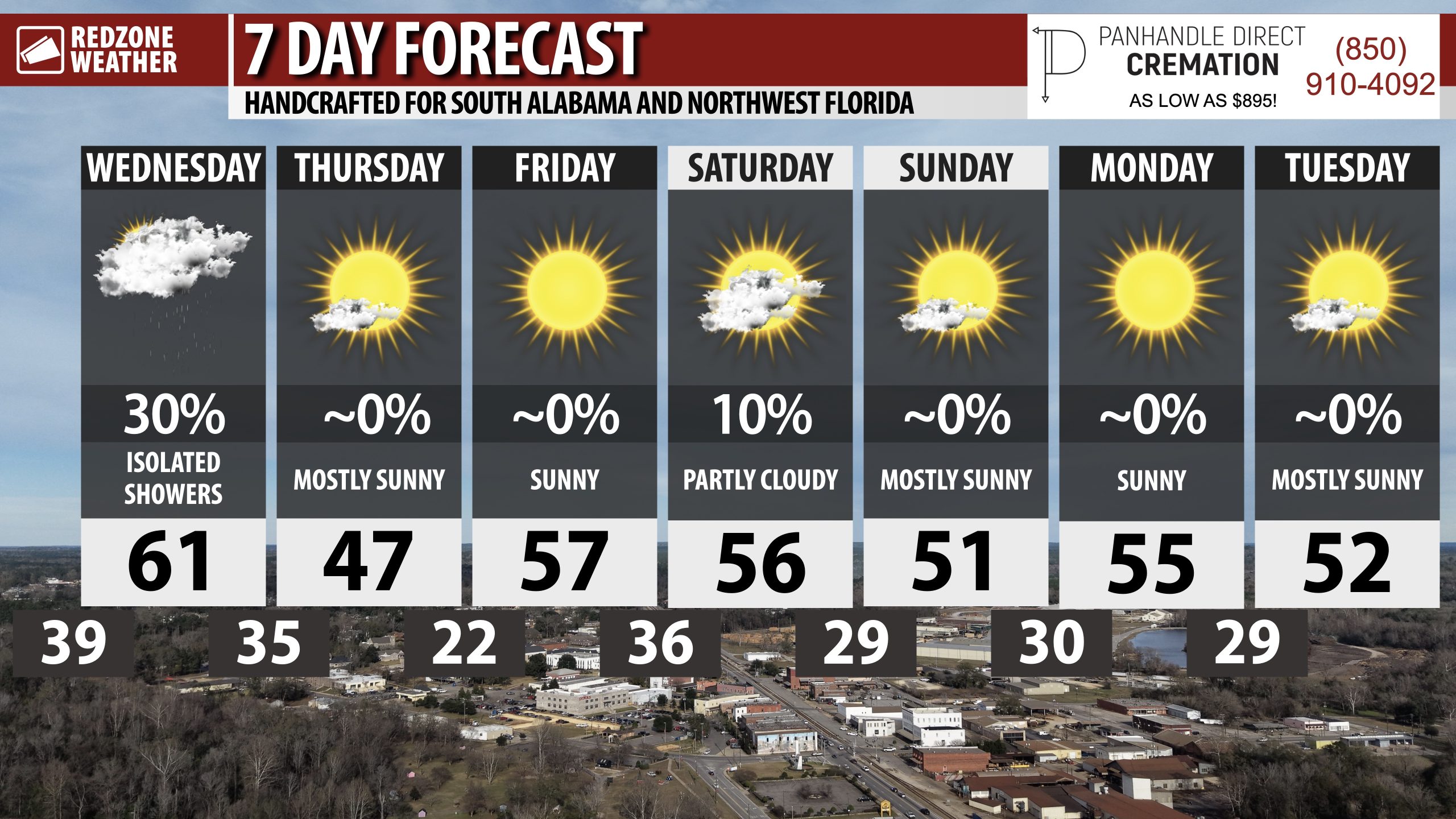 COLD DAYS UPCOMING… After rain clears out later today, we’re headed into what may be the coldest week of the year (potentially). There is a high chance we don’t see 60 degrees for about a week.