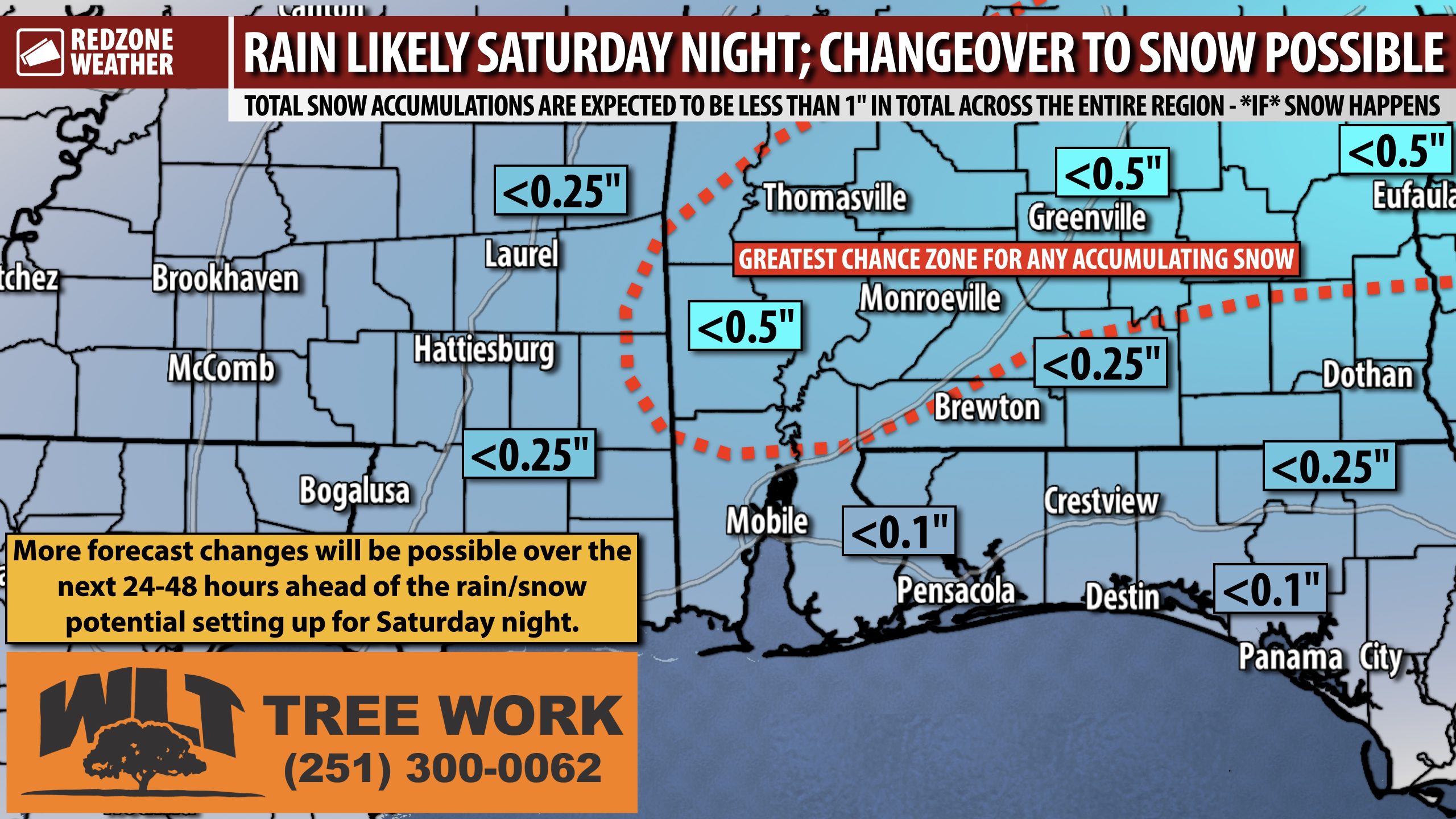 TRAVEL IMPACTS & ROAD CONDITIONS… The greatest potential for accumulating snow will happen across inland areas of southwest Alabama, although there is a real chance that even in that zone, precipitation happens in the form of rain exclusively. Slick spots on local roads will be possible from 10PM Saturday to 9AM Sunday, depending on if a specific location receives precipitation. Regardless of what happens specifically, I would go ahead and plan to stay where you are Sunday morning, at least through 9-10AM IF you’re a person who plans on the course of least regret. Even small amounts of snow can create very slick spots on local roadways. I would imagine if you’re headed out to a morning worship service Sunday morning after 10AM, you will be in good shape across the vast majority of our local area. The reason for this is temperatures will rapidly climb above freezing Sunday morning after 7-8AM. This will help to mitigate more widespread, major travel issues.