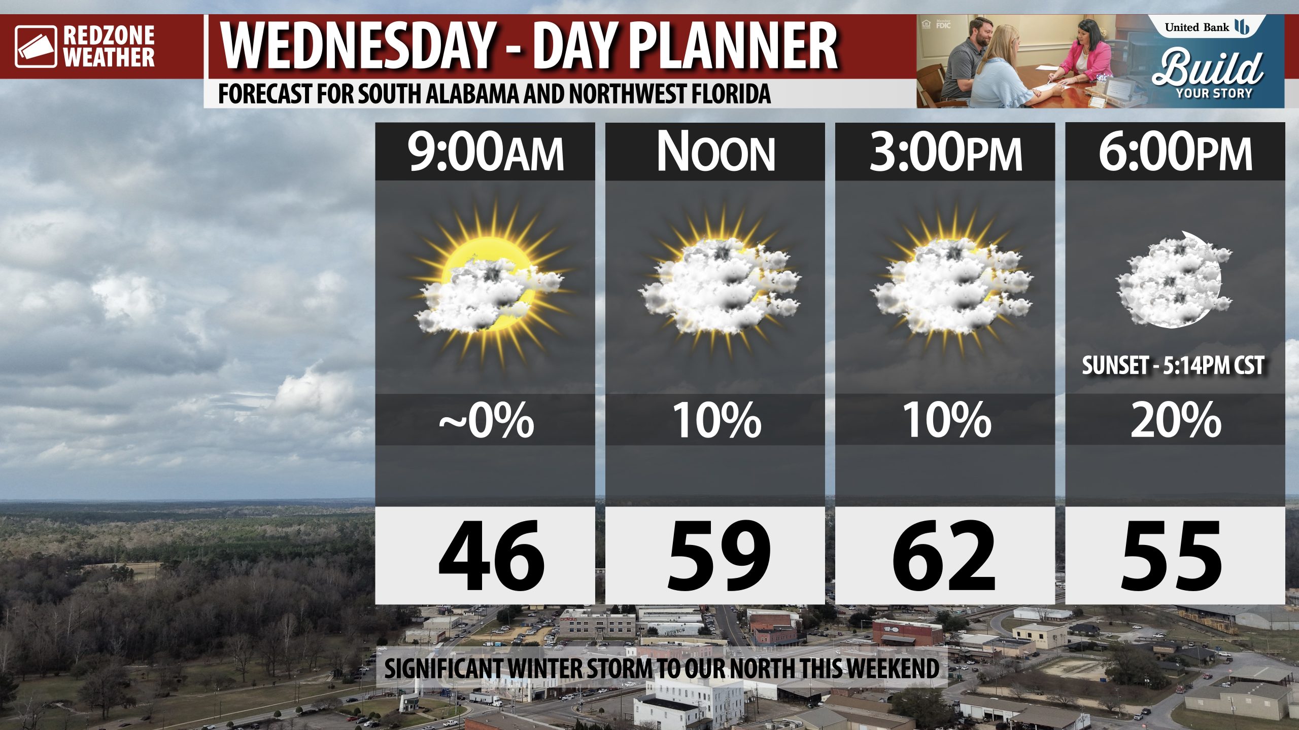 FEW SHOWERS ACROSS WEST ALABAMA LATER TODAY… Increasing cloudiness is expected on this Wednesday. A few rain showers may become possible this afternoon into this evening, particularly across parts of west Alabama.