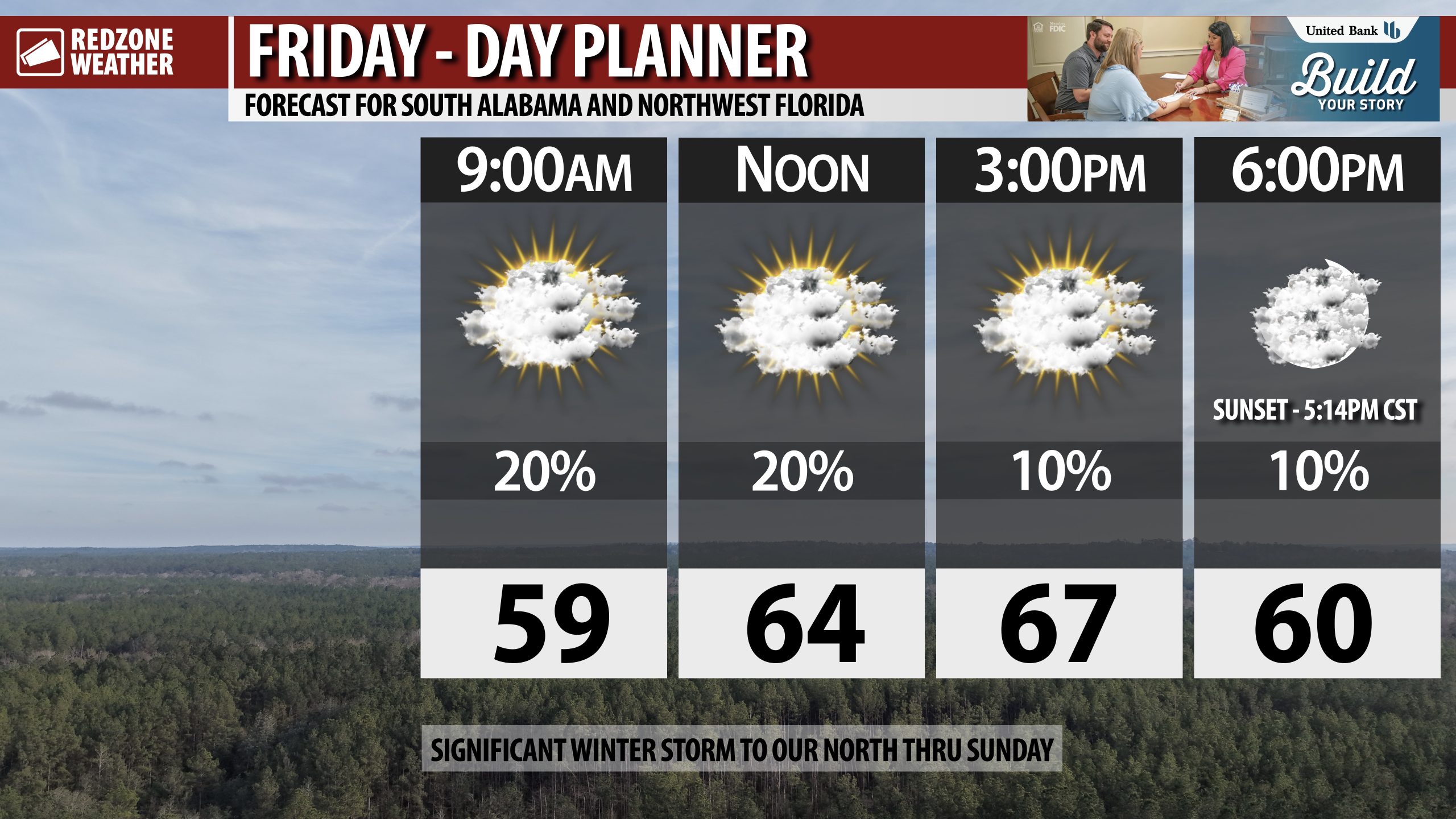 INCREASING RAIN CHANCES TOMORROW… Isolated rain showers may happen across parts of south Alabama and northwest Florida on this Friday. Clouds will persist throughout the day.