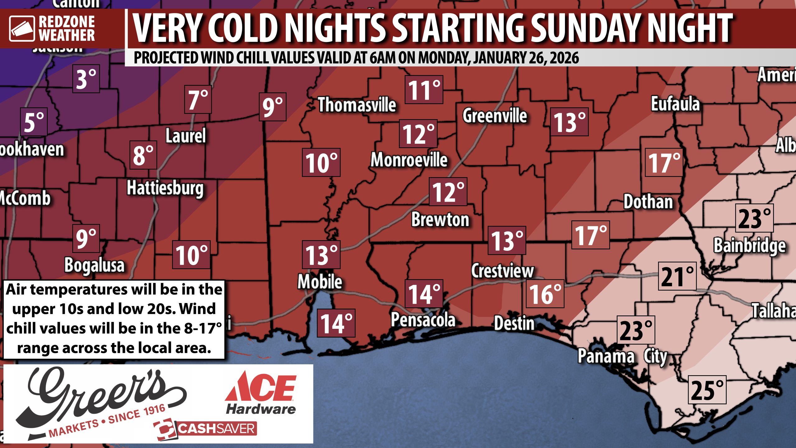 EXTREME COLD WATCH SUN. NIGHT INTO MONDAY MORNING; AIR TEMPS IN 10s AND LOW 20s… Very cold air will surge into the Deep South early next week. Wind chill values will likely be in the single digits early Monday morning across inland areas of southwest Alabama with 10s likely as far south as the beaches. Air temperatures will dip into the upper 10s inland and into the low 20s as far south as I-10 and the coast on Sunday night and again on Monday night. We’re entering into what will be a lengthy cold period starting Sunday night. Before we get there, a dangerous ice storm will happen to our north. We have a low-end tornado risk setting up for Sunday as well.